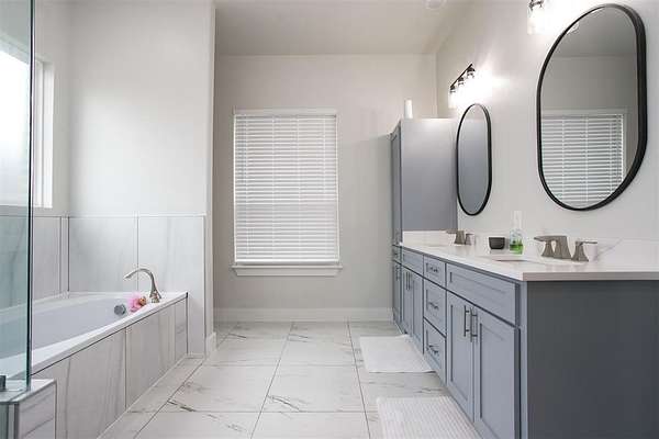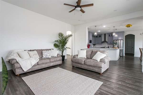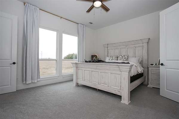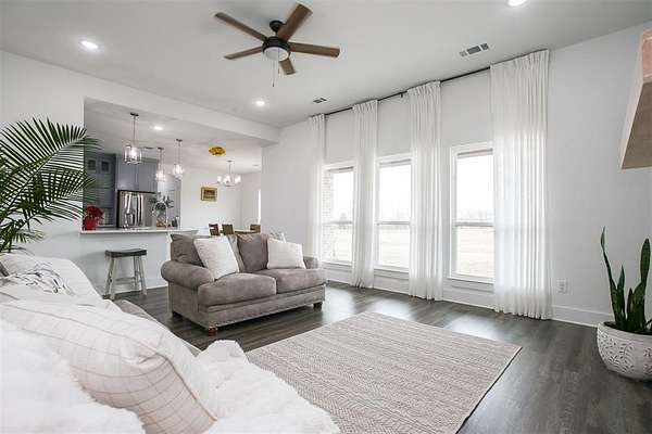 Experience contemporary country living in this stunning 2024-built home, perfectly situated at the end of a quiet cul-de-sac on a sprawling 1.7-acre lot. This move-in-ready, four-bedroom gem impresses with its striking white Austin stone and brick facade, setting the stage for a warm and inviting interior. The versatile layout features a formal dining room with a chandelier--ideal as a home office--and an open-concept design perfect for modern living. The chef's kitchen shines with quartz countertops, shaker-style cabinetry, stainless steel appliances, and a wrap-around breakfast bar, all flowing seamlessly into the cozy living room anchored by a floor-to-ceiling stone fireplace and rich wood-look luxury vinyl floors. The primary suite is a true retreat, boasting serene backyard views, a spa-inspired ensuite with a garden tub, marble vanity, dual sinks, a separate shower, and a custom walk-in closet. Generously sized guest bedrooms, a full-size utility room with built-in cabinets, and an expansive backyard with a covered patio complete the package. With ample space to add a pool, outdoor kitchen, or sports court, this home offers endless possibilities for creating your dream lifestyle. Don't miss your chance to own this exceptional property!