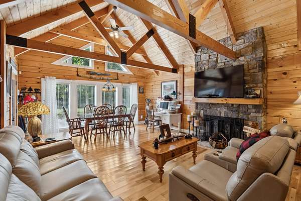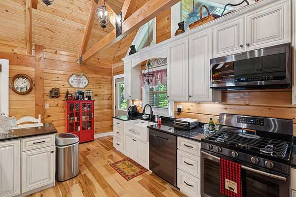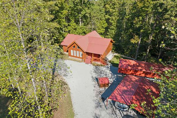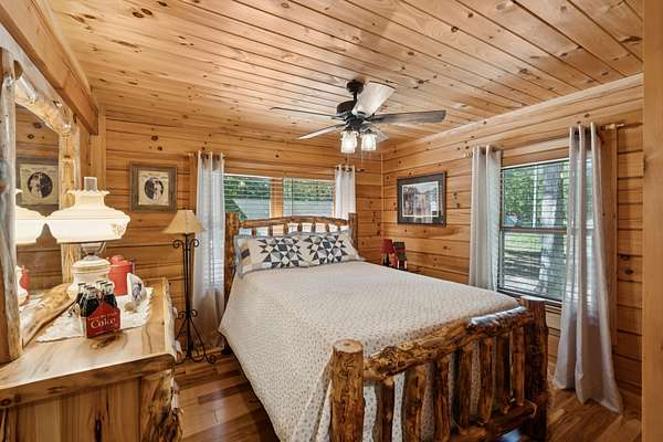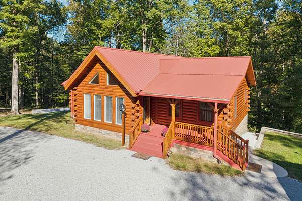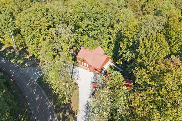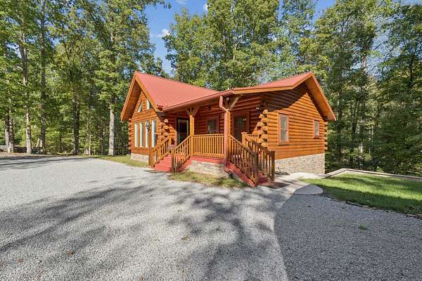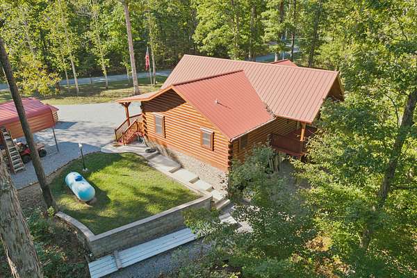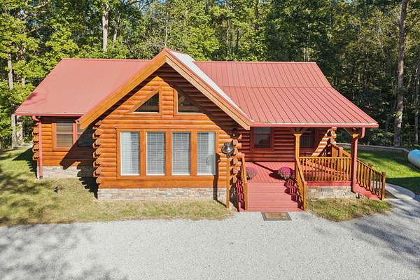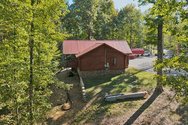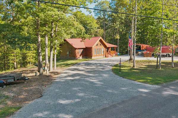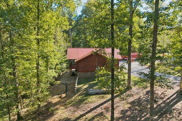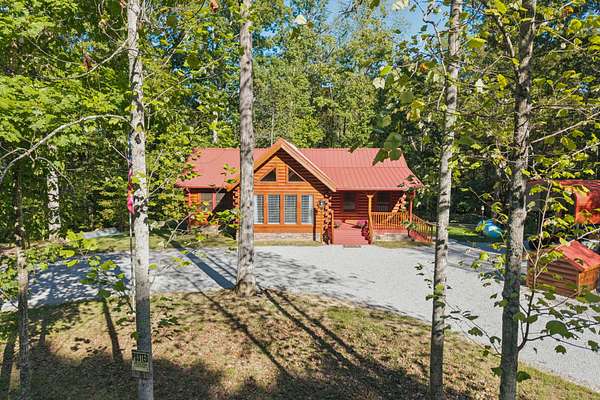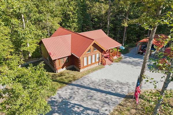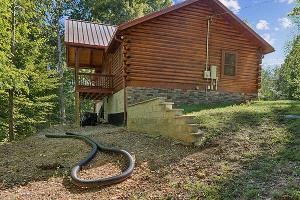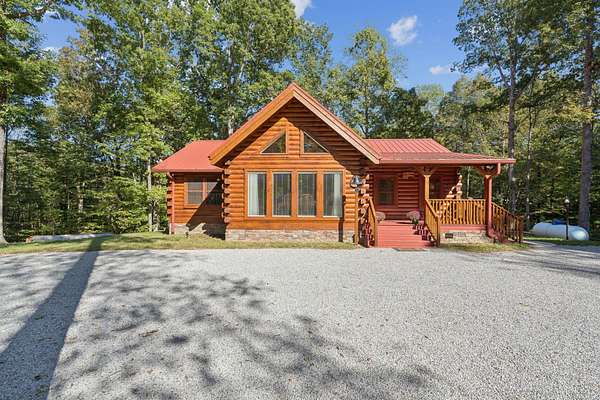 Gatlinburg in Ashland City. Very charming log home barely broken in. Metal roof. Hickory flooring. Great room has a gas fireplace and a vaulted ceiling. Black counters and appliances in the eat-in kitchen with double bar. Double closets in the primary bedroom. Interior built to ADA standards for handicap convenience. Dual heat system and Generac whole house generator. Whole house water filtration. Encapsulated crawl space. Sitting on 5.17 mostly wooded acres. Long road frontage, 637.95 feet, for space away from neighbors. Covered wood porch overlooking trees. Two carports for autos and toys. Electrical and septic service for a camper.