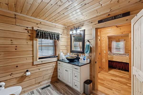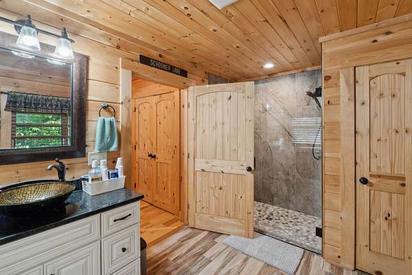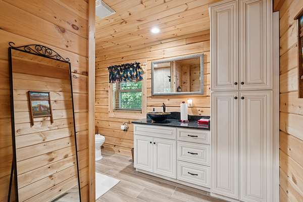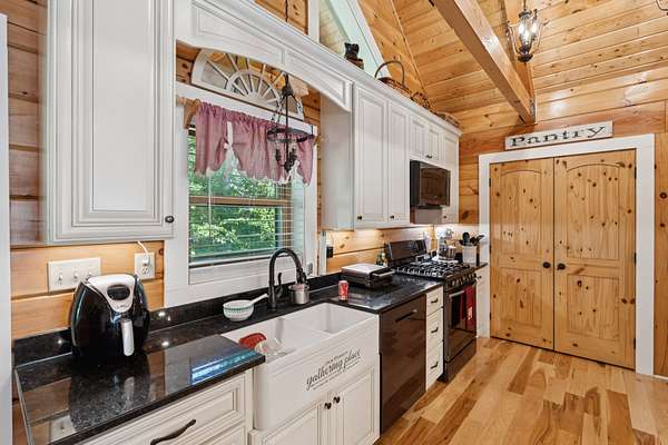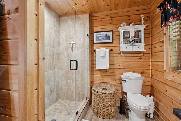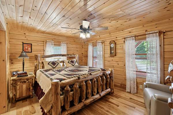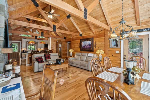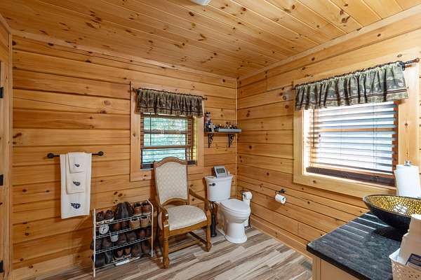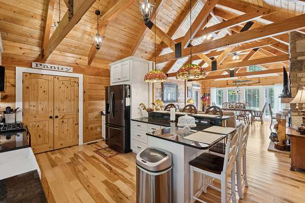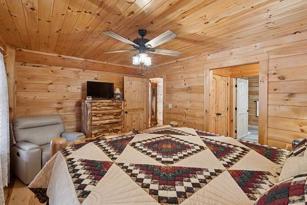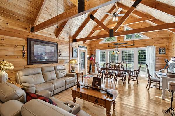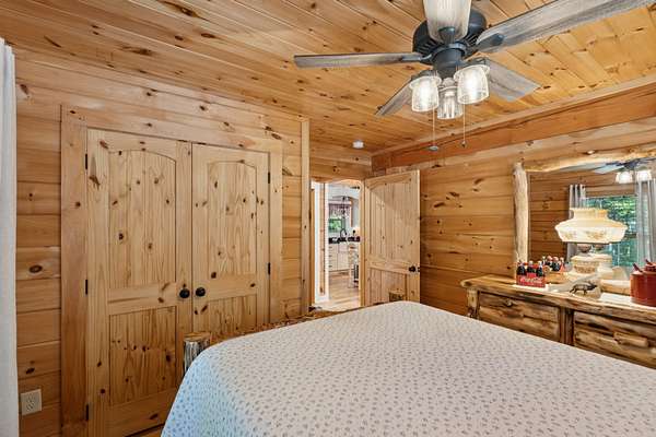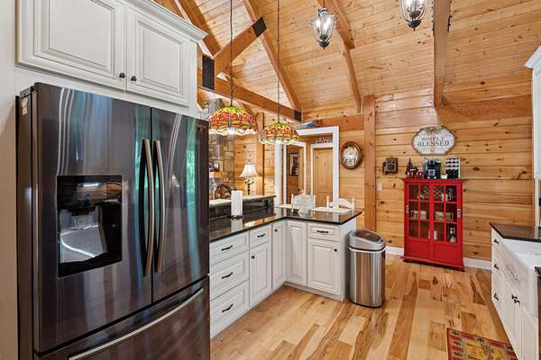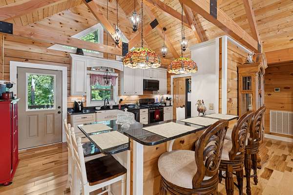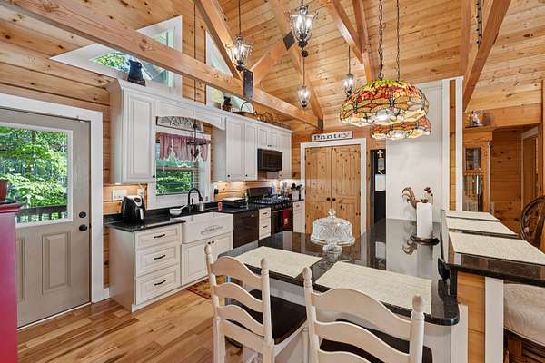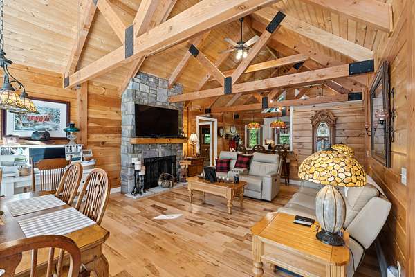 Gatlinburg in Ashland City. Very charming log home barely broken in. Metal roof. Hickory flooring. Great room has a gas fireplace and a vaulted ceiling. Black counters and appliances in the eat-in kitchen with double bar. Double closets in the primary bedroom. Interior built to ADA standards for handicap convenience. Dual heat system and Generac whole house generator. Whole house water filtration. Encapsulated crawl space. Sitting on 5.17 mostly wooded acres. Long road frontage, 637.95 feet, for space away from neighbors. Covered wood porch overlooking trees. Two carports for autos and toys. Electrical and septic service for a camper.