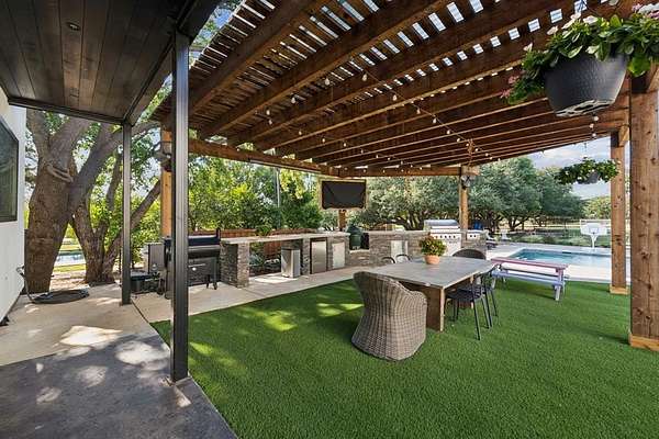 Discover timeless luxury & thoughtful design at 1006 Quail Run Road, a fully reimagined 9,763 sqft estate situated on a beautifully treed 2.56 acre lot in the heart of Southlake's Quail Creek Estates. Originally built in 1987 & extensively renovated from 2021-2025 by the current owners in partnership with Bohanon Design Team, this 7-bed, 10-bath residence blends sophisticated & clean-lined architecture with top-tier infrastructure & finishes. From the moment you enter, you're greeted by natural light & sweeping views, thanks to 124 Anderson E-Series windows throughout. The home showcases a commissioned walnut-and-steel staircase & oversized kitchen island by Stahl Custom Lumber. The residence features 3.5 distinct kitchen & prep areas including a full main kitchen, an entertainment suite-MIL setup, outdoor kitchen & upstairs parlor. Interior highlights include 10ft ceilings, a Level 5 sheetrock finish, quartz window ledges, in-wall vacuum system with Hide-A-Hose tech, connections for 2 washer-dryer sets, hand-scraped white oak floors upstairs & finished concrete on the ground level--no carpet throughout. Cat-V wiring, Google Fire-Emissions detection & Savant media systems elevate everyday living, while sound-dampening insulation ensures privacy across all living & entertainment zones. Every detail was upgraded--95% of wiring, all plumbing including a fire suppression system, four new HVAC units, foam encapsulation from roof to base & central steel beams designed to exceed 5x load requirements. The outdoor oasis is just as impressive. The backyard features a 45,000-gallon, 10ft deep pool & spa with recently upgraded saltwater equipment, a custom Ipe diving dock, lush landscaping with mature oaks & Japanese maples & a turf athletic field with walking track & bleachers installed by the same professionals behind the Frisco Star. With no expense spared & no detail overlooked, this is truly a rare opportunity to own a contemporary, one-of-a-kind estate in Southlake, Texas.