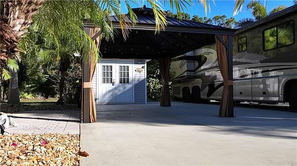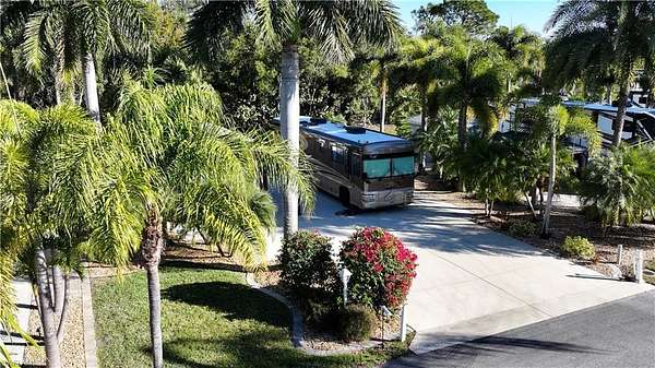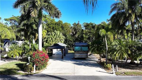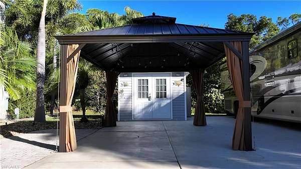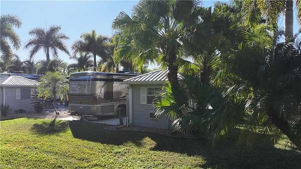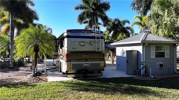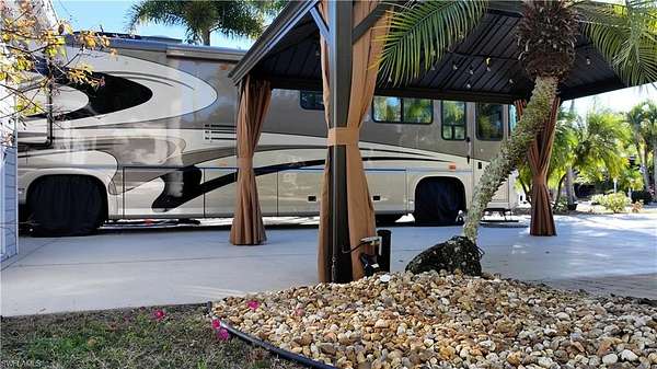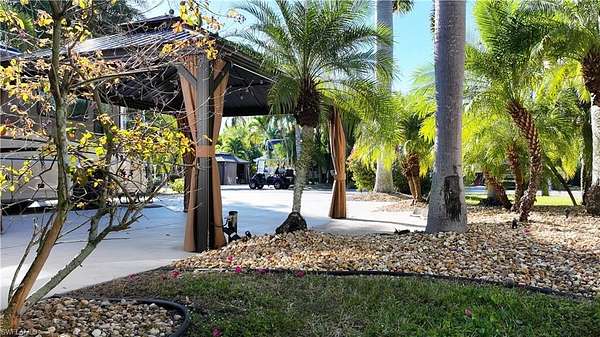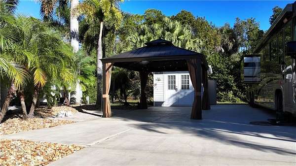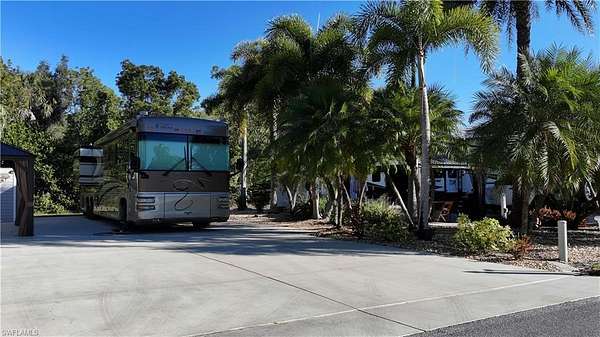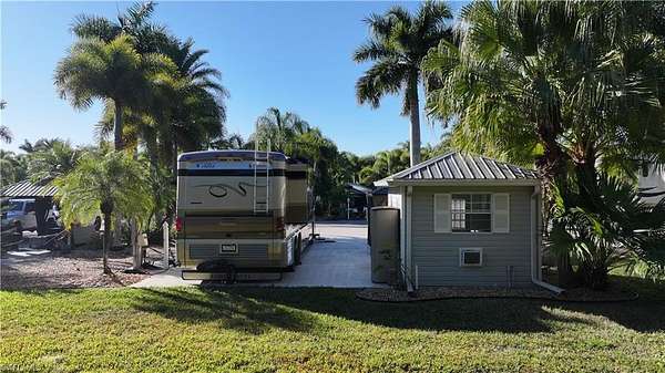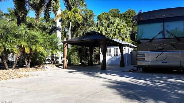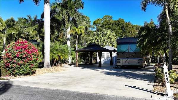 Welcome to Lot D140 in the highly desirable Cypress Woods RV Resort in Fort Myers, Florida. This south-facing RV lot, located in the sought-after D Section, offers exceptional privacy, tropical surroundings, and approximately 4,700 square feet of versatile outdoor living space. The property is surrounded by mature palm trees, creating a lush tropical ambiance while providing comfortable shade throughout the morning and afternoon. The lot backs to a green space, offering added privacy and an ideal area for pets or peaceful outdoor enjoyment. Recently painted concrete enhances the clean, well-maintained appearance of the property. A 12x16 hardtop gazebo with electric provides an excellent space for outdoor dining, entertaining, or relaxing. The fully finished accessory building adds significant value and functionality and includes a washer and dryer, shower, toilet, refrigerator, and a Murphy bed, making it ideal for guests or extended stays. Cypress Woods RV Resort is a gated, amenity-rich community featuring two heated pools and hot tubs, pickleball, shuffleboard, fitness center, billiards, and an active clubhouse with year-round social events. The resort is pet-friendly and welcomes Class A, Fifth Wheel, and Class C RVs. Conveniently located near beaches, shopping, dining, and entertainment, this property offers the perfect combination of comfort, privacy, and resort-style living in Southwest Florida.