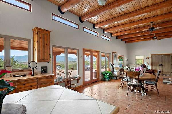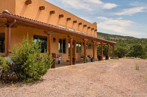 Welcome to this custom home (with guest house) that sits on 42 acres backing to BLM land with gorgeous mountain views. As you approach this lovely home you will notice the hand carved cherry front doors and wrap around covered porch. Perfect for morning coffee or an evening cocktail. As you enter the home you will see the Douglas fir ceiling with wood logs and striking kiva fireplace. A light and bright open floor plan offers views from every corner with multiple windows. The living room flows easily into the dining area and kitchen. Great for entertaining! The kitchen offers Beetle kill wood cabinets, tile counters, and spacious pantry. The primary en-suite offers a gas fireplace and full bath with soaking tub, double sinks, separate shower, and walk-in closet. This home offers 2 additional large bedrooms and a second full bath along with an oversized laundry room. Don't miss the detached garage! Special touches make this home one of a kind!