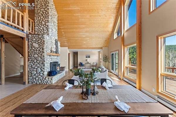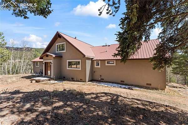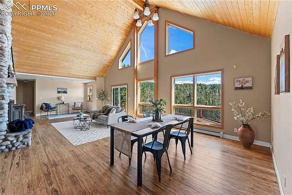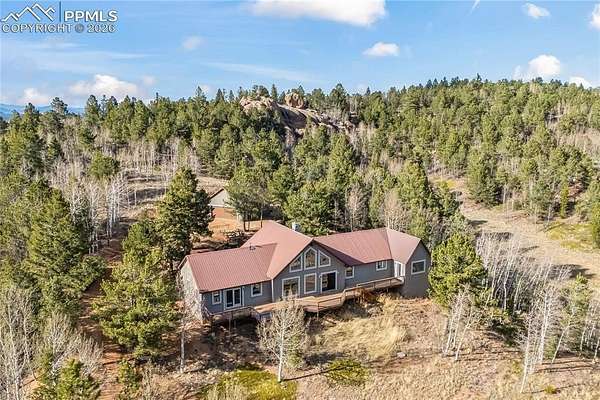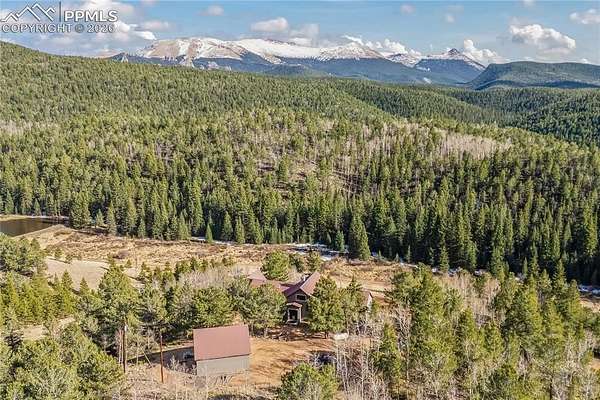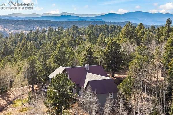 Tucked away on 11.5 private acres in the gated community of Raspberry Mountain, this is the Colorado mountain lifestyle you've been dreaming of. Surrounded by towering pines and endless sky, this property captures truly breathtaking views-from the backside of Pikes Peak to the distant Sangre de Cristo range and Collegiate Peaks. It's the kind of setting that makes you slow down, breathe deeper, and stay a little longer. Inside, the home was designed to bring people together while still offering space to retreat. The open-concept main level features a spacious kitchen made for gathering, flowing seamlessly into the dining and living areas. A stunning floor-to-ceiling stone fireplace anchors the space, while expansive windows frame the landscape and flood the home with natural light. The primary suite is its own private haven, complete with an en suite office and a luxurious bathroom-perfect for quiet mornings or productive afternoons with a view. Each additional bedroom also features its own bathroom, offering comfort and privacy for family or guests. Upstairs, a loft overlooks the main living area, creating a versatile bonus space ideal for a playroom, studio, or cozy reading nook. Step outside to a deck that spans the length of the home, with multiple access points from the living area and bedrooms-perfect for soaking in the views, entertaining, or simply enjoying the peaceful surroundings. Additional features include a detached oversized two-car garage and the flexibility to have chickens, giving you the option to embrace a more self-sufficient lifestyle. Located within a gated community with a low-cost, minimally restrictive HOA, this property offers the rare combination of privacy, freedom, and accessibility. Whether you're looking for a full-time residence, mountain retreat, or a place to truly unplug, this is where Colorado living comes to life.