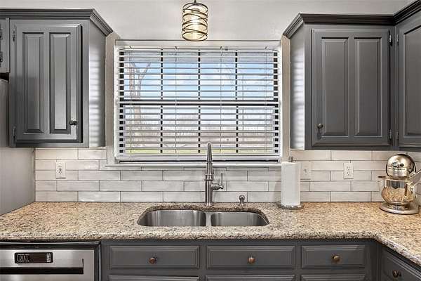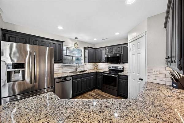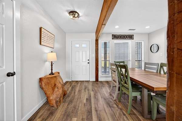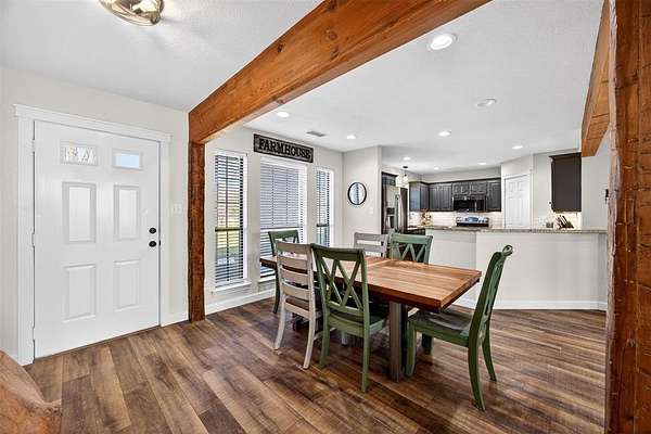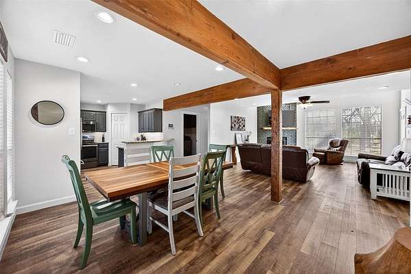 The split-bedroom layout provides privacy, while the open-concept living area showcases warm wood beams, updated flooring, abundant natural light, and a beautifully renovated kitchen with granite countertops, stainless steel appliances, subway tile backsplash, and custom cabinetry. Major improvements include a new roof and upgraded HVAC system, giving buyers peace of mind for years to come.
