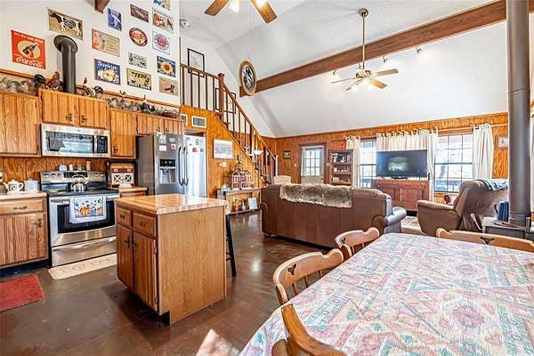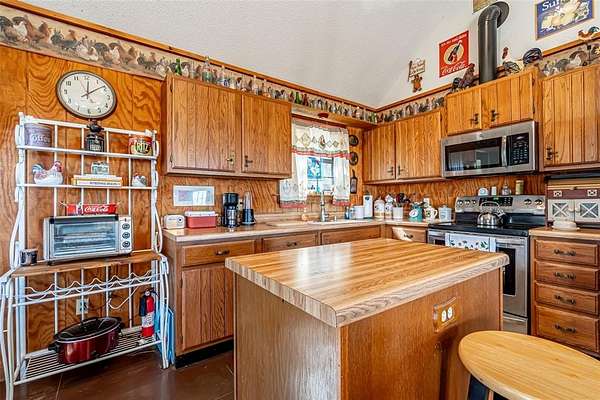 - Decorative Lighting, Eat-In Kitchen, High Speed Internet Available, Kitchen Island, Natural Woodwork, Open Floorplan, Vaulted Ceiling(s)