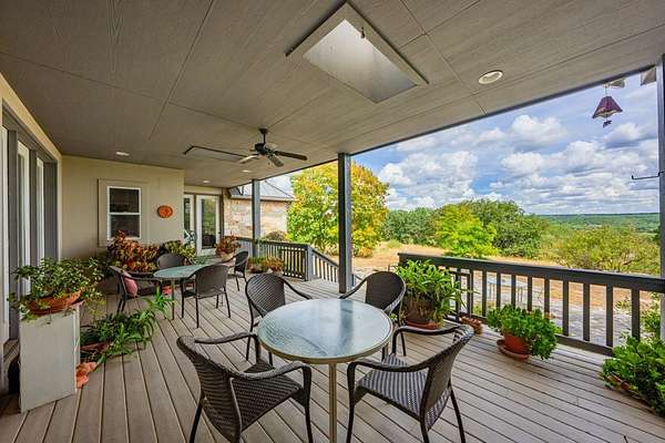 This exceptional custom one-owner home offers 4,098 sq. ft. on 10.33 acres in the gated Kamira Subdivision, ideally positioned on a peaceful corner lot with sweeping Hill Country views and outstanding privacy just minutes from town. The expansive great room features soaring cathedral ceilings, a grand masonry fireplace, large picture windows that capture breathtaking vistas, and a wet bar with a sink for easy entertaining. The open kitchen provides excellent flow with double ovens, a spacious island, wood cabinetry, and abundant counter space, while the adjoining dining area includes custom built-ins and an extended buffet-style display counter. The main floor hosts three bedrooms, including a primary suite with large windows, his and hers separate bathrooms, and two oversized custom closets with built-ins. Upstairs are two additional bedrooms, each with its own ensuite bath-perfect for guests or family. Perched on a hill, this home's patios and interiors showcase stunning panoramic views-an exceptional opportunity to own a property that perfectly blends comfort, craftsmanship, and natural beauty.