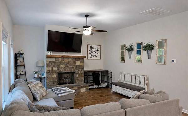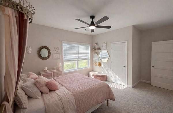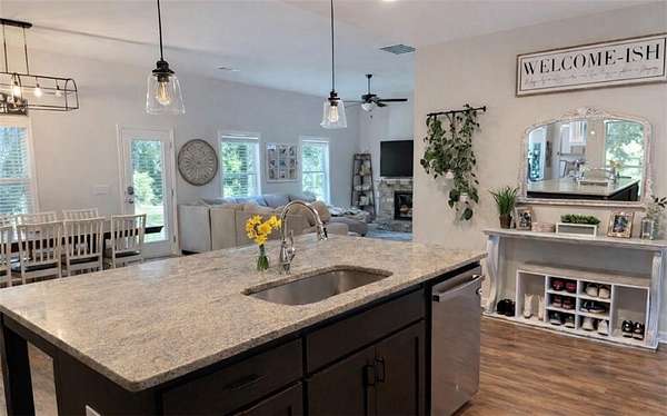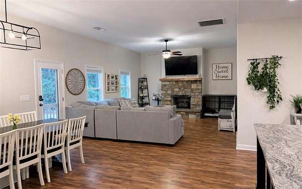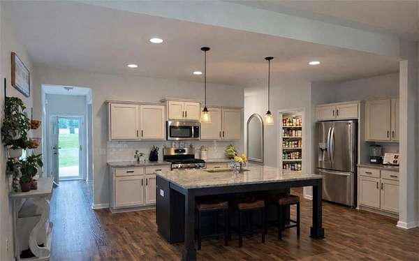 Welcome to Fenwick Farms! This nearly new, gorgeous home sits on an amazing private 3.82 acre with a fenced backyard. The open floor plan invites you in to the formal dining room with versatility as a bonus room/office with judges paneling. The kitchen is open to the breakfast area and the family room with a gas fireplace. It boasts a gas stove, quartz countertops, a huge island with bar seating, plenty of cabinet storage and a walk-in pantry. The primary suite has a sitting area/nook, as well as a spacious bathroom with his and her sinks, garden tub, separate tiled shower, and a walk-in closet with custom shelving. Entertaining is a breeze with the covered patio wired for a TV and the fenced in backyard with views of the wooded lot. Additional features include attic space over the garage, built-in ceiling storage system in the garage, energy efficient windows, and high speed internet.