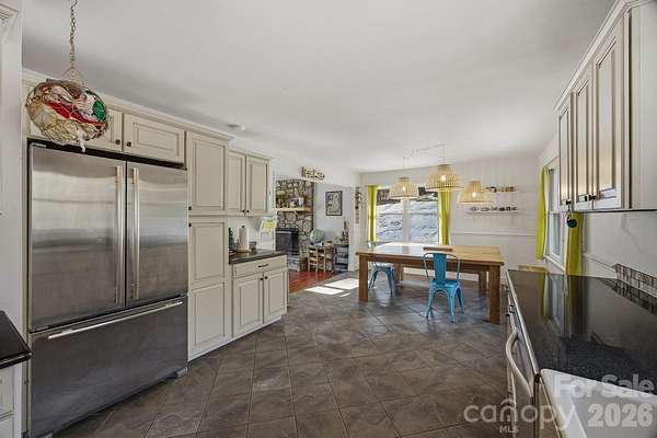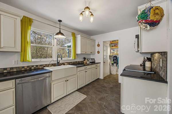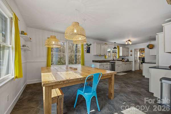 Situated on 3 spacious lots in an established neighborhood, close to town, but with that rare "only house on the road" energy, this wonderful 3BR/2.5BA home feels private without being isolated. An outdoor set-up built for great fun: powered workshop, a playhouse ready for imagination, creek frontage and pet-friendly fenced yard. Wide covered back porch sets the tone for relaxed living with the creek as the perfect natural backdrop. Inside, the flexible layout offers two distinct living areas. Main level has a spacious living room with gorgeous stone fireplace, large galley-style kitchen with pantry and dining area made for a long table. Three bedrooms are located on the main level, including a primary suite featuring a large walk-in closet, 1/2 bath and private access to the covered back porch. The finished basement offers separate living quarters with a kitchenette, living room, spacious room being used as a bedroom and bath featuring a soaking tub and shower-perfect for multi-generational living. A bright tiled sunroom with access to the fenced area is great for pet and plant lovers. Plenty of storage and closets throughout, as well as a long wall of closets and shelves in the basement to help keep things organized. Main and Lower level kitchen appliances convey.