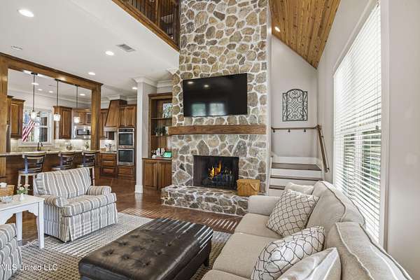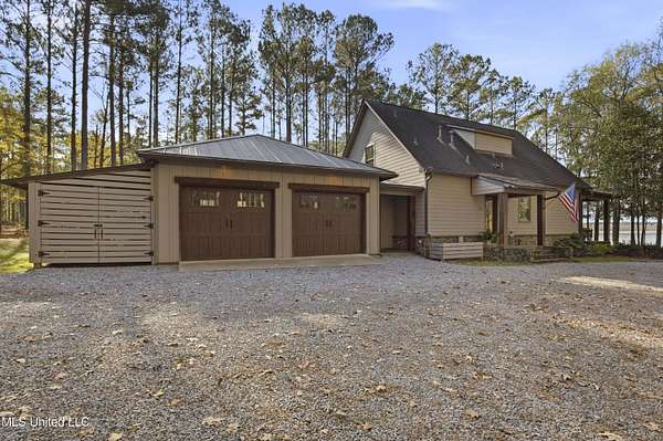 Rare opportunity in The Retreat in Charlton Place! This well-maintained farmhouse-style home sits on approximately 5.8+/- acres overlooking the lake and offers exceptional privacy. The open concept plan features a light-filled great room with fireplace, granite counters, eat-at bar, pantry, stainless appliances, gas cooktop, refrigerator, and double ovens. The dining area flows easily into the main living spaces. The primary suite is located downstairs, and the primary bath includes a unique layout with separate access to the half bath-ideal for additional vanity space. A laundry room with sink is also on the main level. Upstairs includes a loft/bonus room that could be converted into a 3rd bedroom, along with a secondary suite and hall bath. Additional features include an oversized garage with storage, a relaxing front porch, and a wooded setting for added privacy. The home is located in The Retreat, a private gated section just inside Charlton Place. Rare acreage, lake views, and a beautiful setting-don't miss this one!