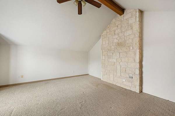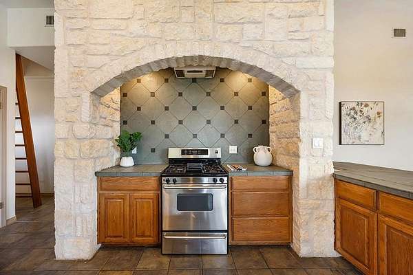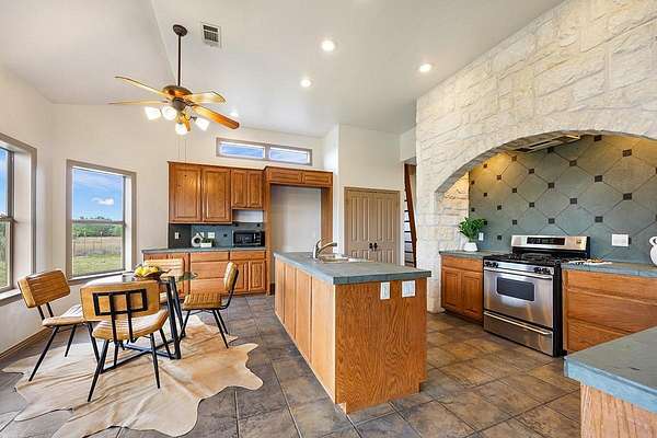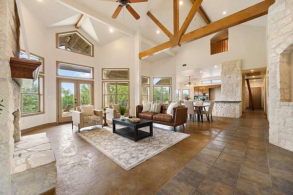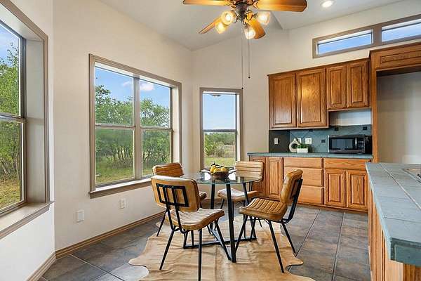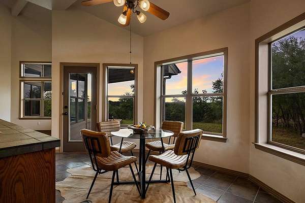 Welcome to 101 Maheo Drive, offering spacious living, high beamed ceilings, and flexible spaces, all set on 13 beautiful Texas Hill Country acres. This recently painted home offers four bedrooms and two bathrooms, with all bedrooms on the main level. Two lofts, accessed by ladders, provide flexible space for a reading area, kids' hideout, or additional use. High beamed ceilings and a wood-burning limestone fireplace bring warmth and character to the living room, while large windows capture northern light, filling the home with natural brightness and private views of oak trees and rolling hills. The spacious kitchen features a limestone accent wall and ample room for entertaining. A unique pass-through fireplace connects the living area to the primary bedroom. The primary bathroom includes a soaking tub, separate shower, and dual closets. Outdoor living is a defining feature, with a large covered back porch and elevated deck positioned to take in long-range views, ideal for quiet mornings and evenings. Set on a hilltop, the 13-acre property offers wide, uninterrupted views, mature oak groves, and a strong sense of privacy. A wet weather creek cuts through rugged limestone along the northern portion of the land, with a natural grotto feature. Varied terrain adds interest, and a horse pasture sits at the front of the property. It include a detached two-car garage with workshop, basketball goal, metal roof, and a 60,000-gallon rainwater collection system providing the home with some of the best tasting water in the world! The property supports true Hill Country living, allowing horses, cows, sheep, and goats, with barns and shops permitted. There is potential to pursue an agricultural exemption with proper documentation. Zoned to highly rated Dripping Springs ISD schools, low tax rate, light restrictions and low HOA. Interested in a family compound? Purchase the adjacent property for sale at 102 Rocky Creek and you can have 25 acres with 2 homes.