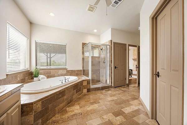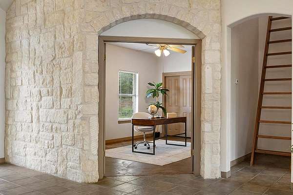 - Breakfast Bar, Cathedral Ceiling(s), Ceiling Fan(s), Ceiling-High, Ceiling-Vaulted, Double Vanity, Entrance Foyer, Kitchen Island, Open Floorplan, Primary Bedroom On Main, Recessed Lighting, Soaking Tub, Study/Home Office, Tile Counters, Walk-In Closet(s)