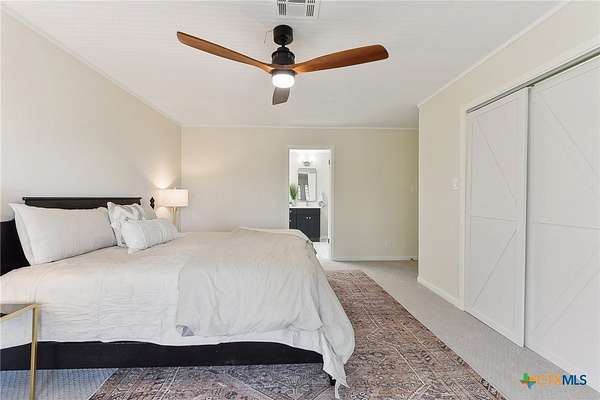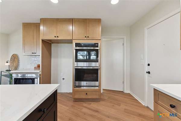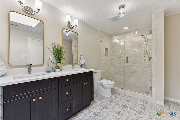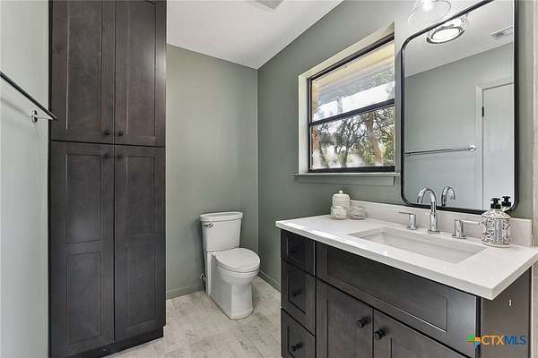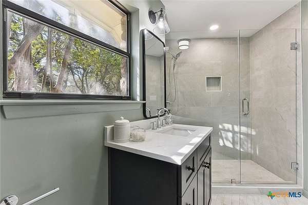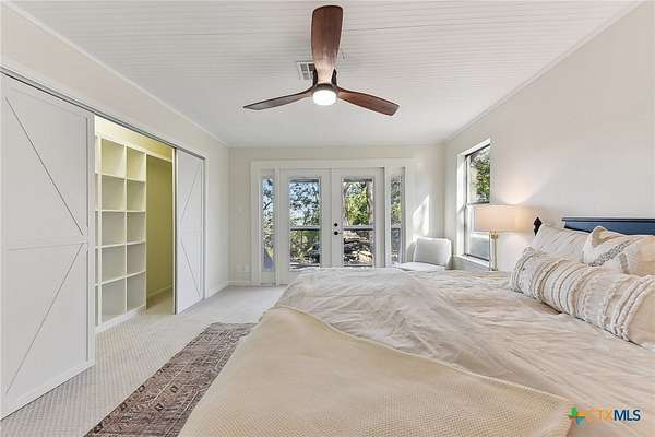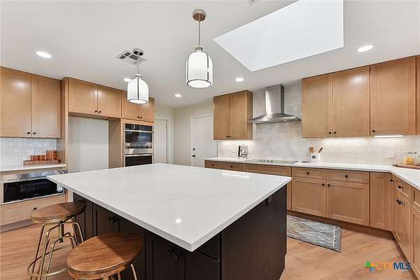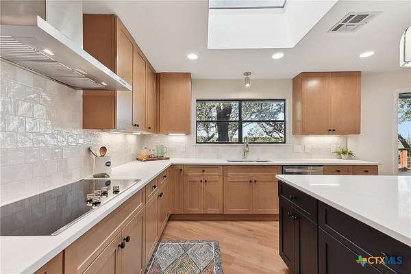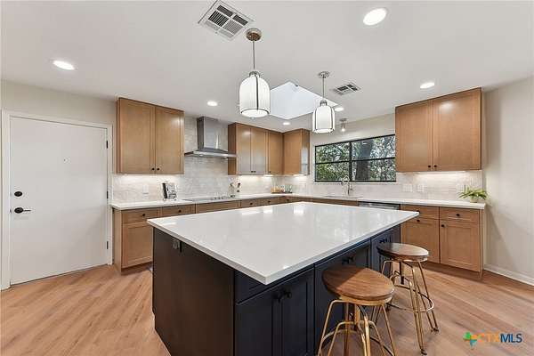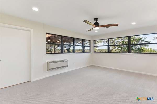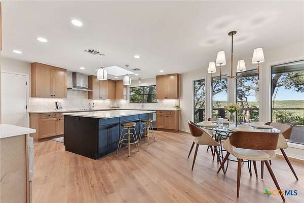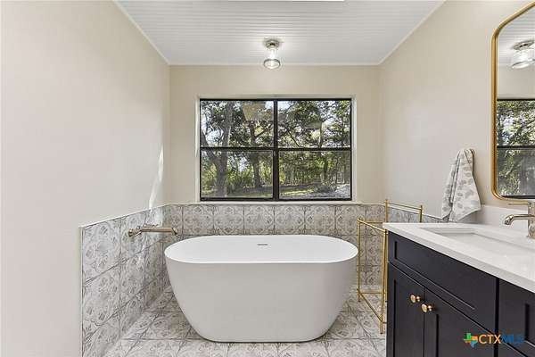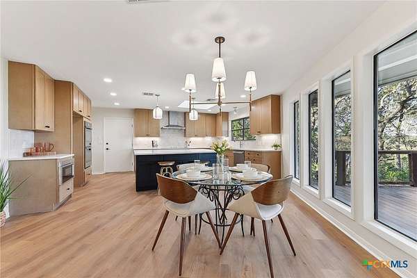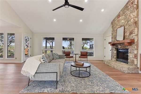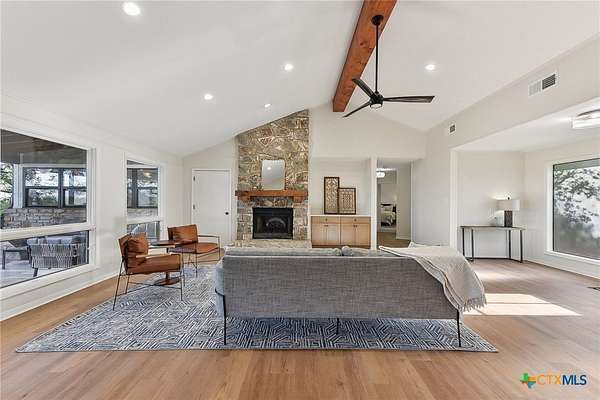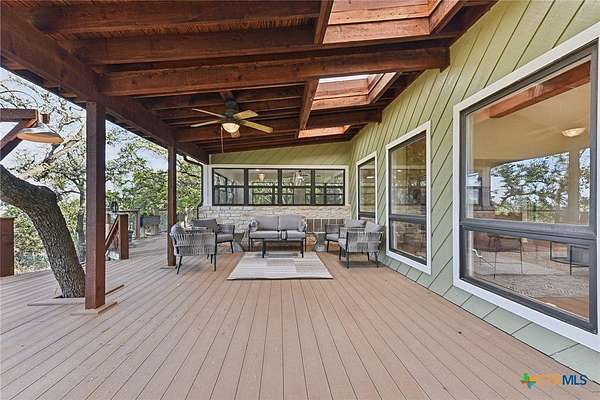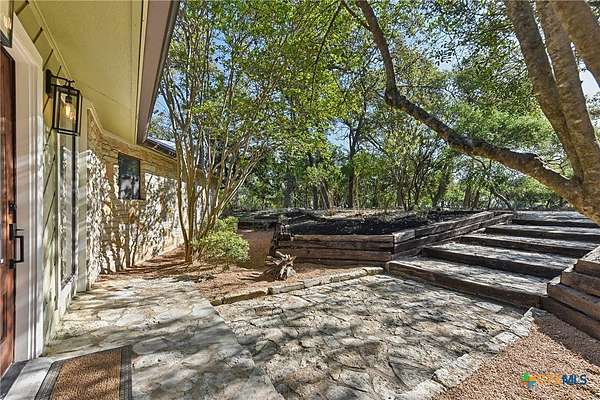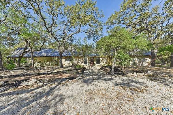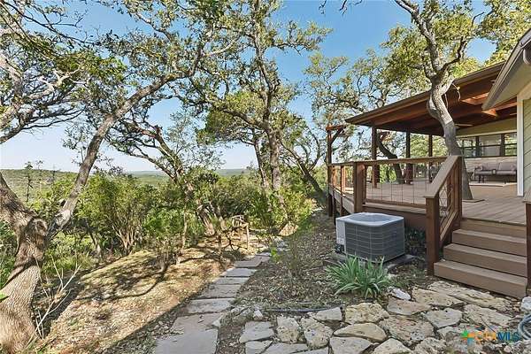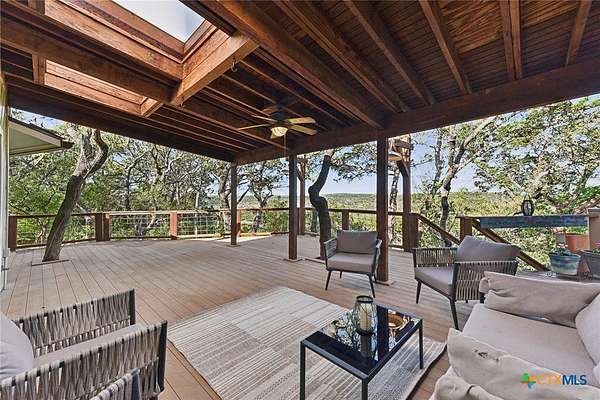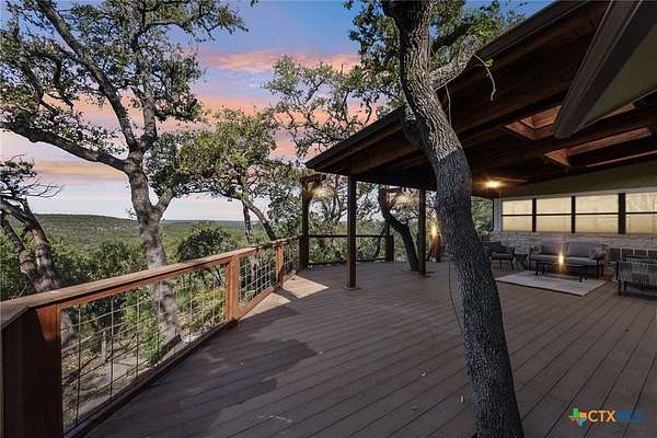 Masterful designs are uniquely embodied in this tranquil, gorgeous, fully remodeled home nestled on an 8-acre lot. Updated landscaping and soaring shade trees are only the beginning of this spectacular house. The highlight of this property is the view-Hill Country Sunsets for miles, Koi ponds, and a quiet community. The plentiful, large windows allow natural light to flood the home and highlight the exquisite details. The living area is bright and open, with high ceilings, a stone floor-to-ceiling fireplace, cedar beams, a built-in cabinet, and many windows. Luxury Vinyl Plank is throughout most of the house. Your updated kitchen is an entertainer's delight. It features stainless steel appliances, sparkling quartz counters, a smooth electric cooktop, an island, a breakfast bar, a tile backsplash, pendant lights, a built-in microwave, double ovens, and a breakfast bar. Your spacious primary features plush carpet and a spacious walk-in closet with thoughtful cube shelving. Your primary bedroom has private access to the deck. Your ensuite is STUNNING! It has a double vanity, a soaking tub, and a walk-in shower. Whenever you enter this exquisite space, you'll feel like you're stepping into a spa. Your second bedroom has 360-degree windows, allowing Hill Country views all around. Your third bedroom has a private entrance to the deck. Your secondary bath has a single vanity, a linen cabinet, and a large walk-in shower. You'll swoon over your covered deck. The shaded trees and sounds of nature offer peace and relaxation. A short drive to Wimberley offers access to boutique shopping, fantastic local restaurants, and nearby attractions like Wimberley Zipline Adventures-perfect for weekend fun and entertaining guests. This property features fresh interior and exterior paint, an updated roof (2024), and an updated HVAC system (2020) for added peace of mind. Plus, enjoy the benefits of a low tax rate and NO HOA.