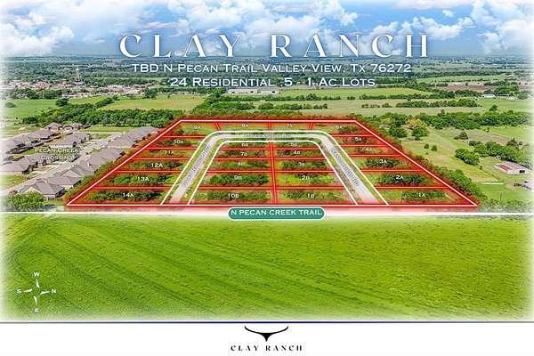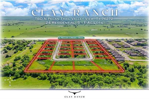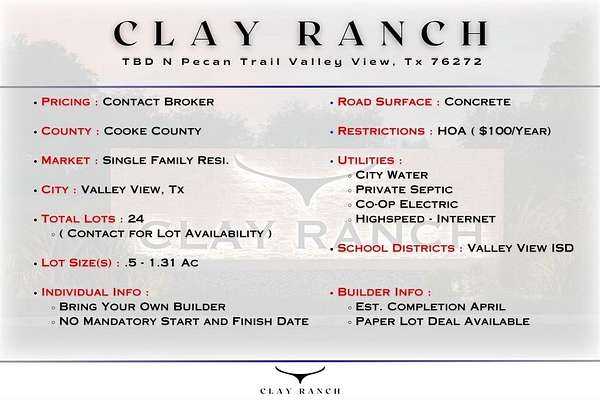 Discover Clay Ranch, a brand-new community in Valley View, TX. This exclusive subdivision offers spacious half-acre and acre lots with city water, private septic, high-speed internet, and co-op power. Designed for both convenience and quality, the neighborhood will feature concrete roads and minimal HOA restrictions, with annual dues of just $100.