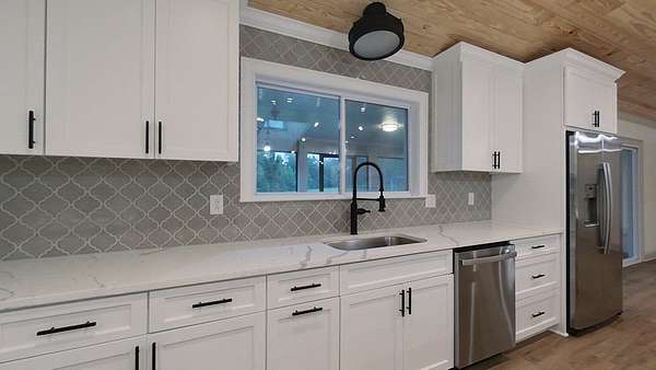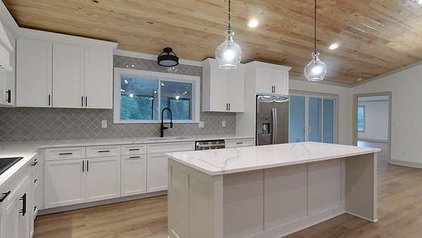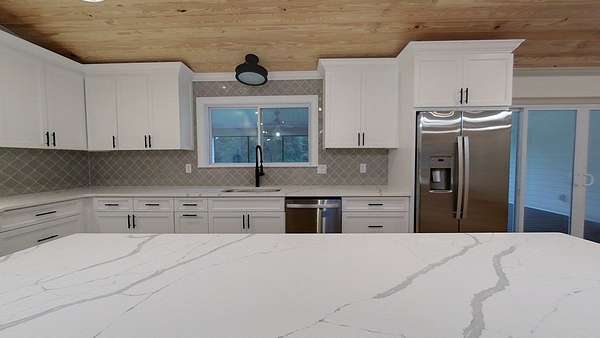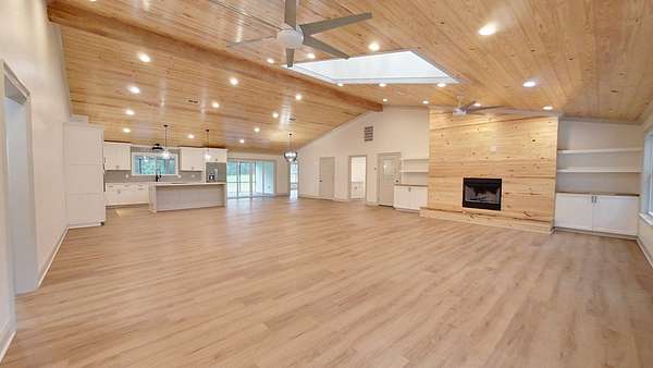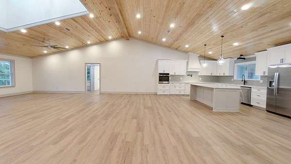 Where southern charm meets modern day elegance! This inviting remodeled home is filled with custom shelving all throughout, hard surface countertops, LVP flooring, and beautiful real wood tongue and grove ceilings and fireplace hearth. 101 Sandy Creek Lane is situated on over a 4-acre lot with pond view and welcomes you into an open floor plan with 3 spacious bedrooms ,2 bathrooms and large office/study could be a 4th bedroom. Master bathroom has luxury tiled shower and double sinks. A seamlessly blended living, dining, and kitchen combo with a sliding glass door entry way taking you into an extensive screened in porch. Just minutes away from town this home is perfect for you and can be yours! Call your favorite realtor to make an appointment today!