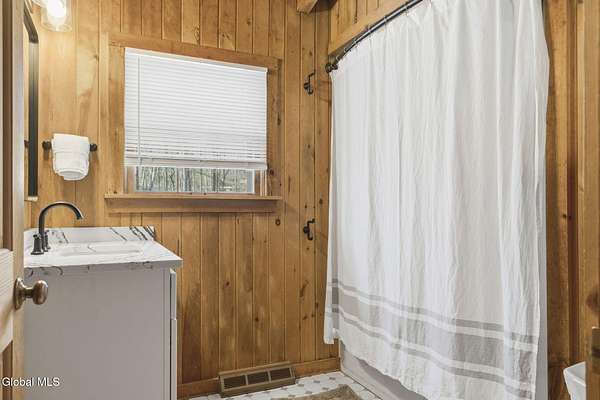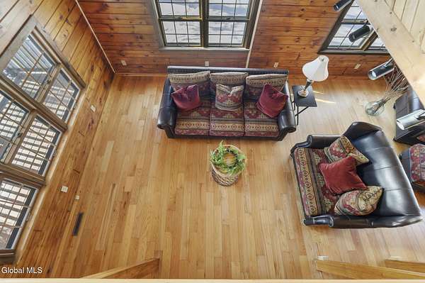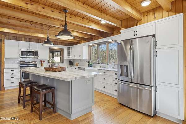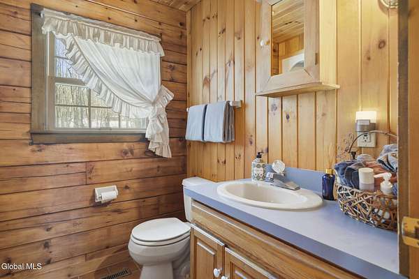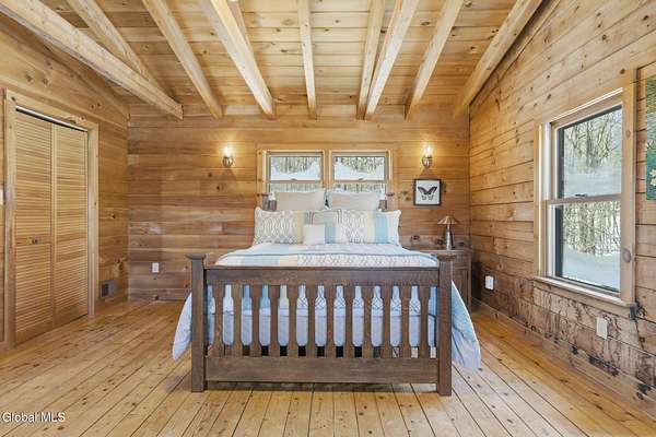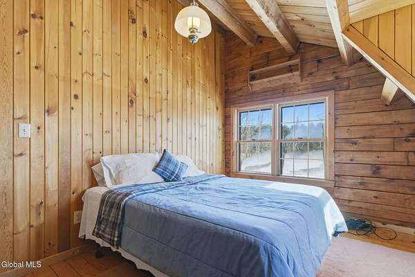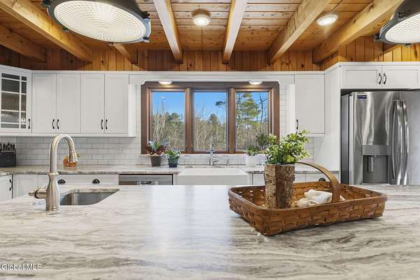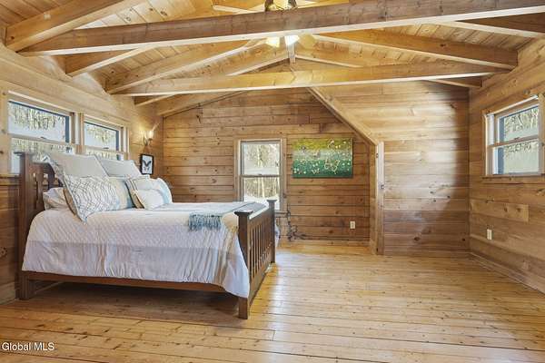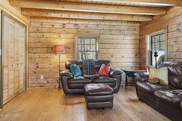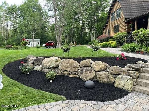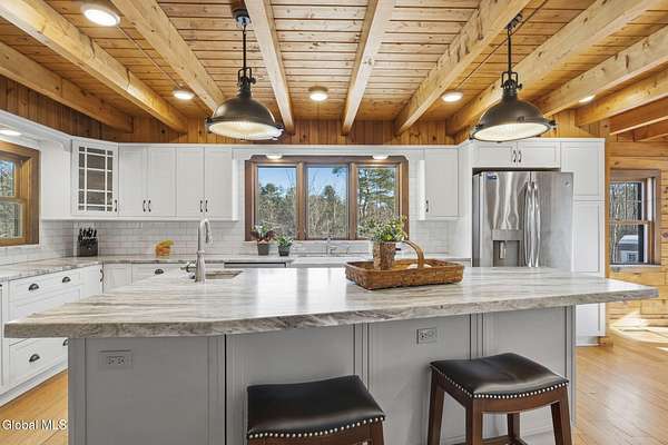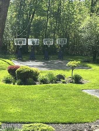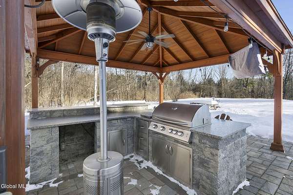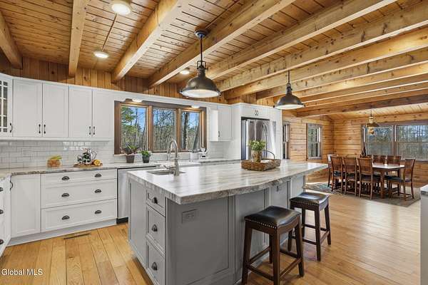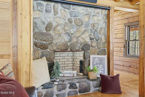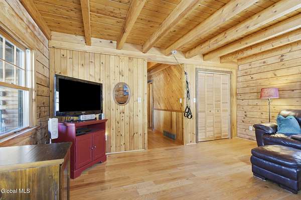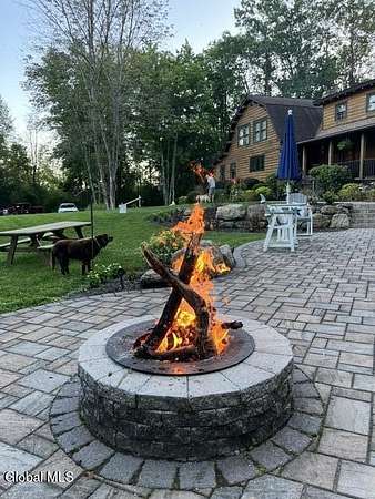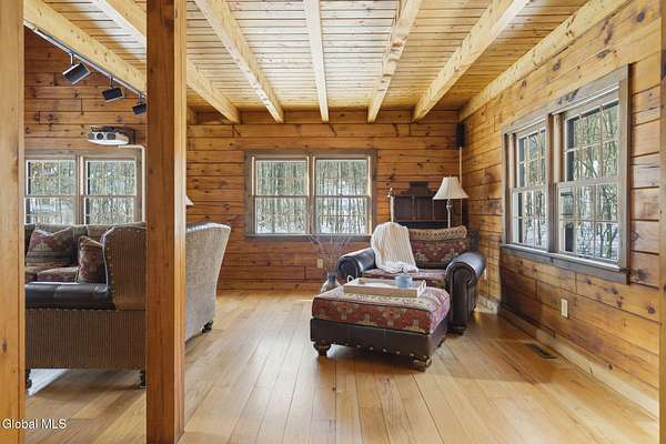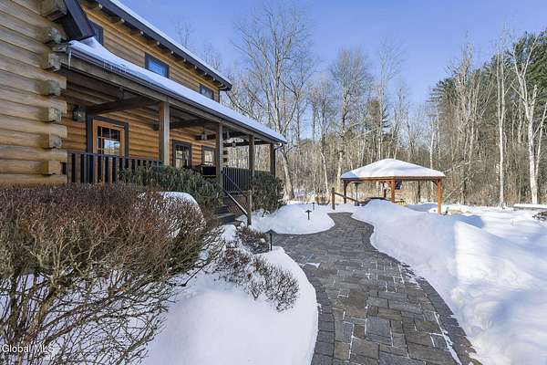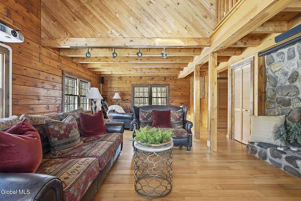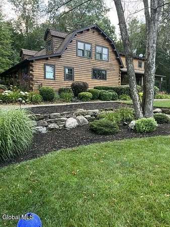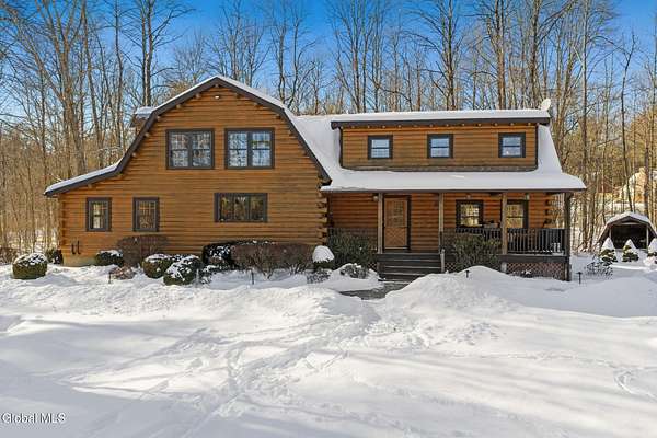 Welcome to this exceptional 2824 sq ft log home retreat set on 18+private acres in the highly sought-after Burnt Hills School District. Blending rustic charm with modern upgrades, this 4 bed, 3 bath home offers space, comfort and unforgettable outdoor living. Inside, you'll find wood and tile flooring throughout, a beautifully updated kitchen with newer appliances, enameled cast iron farmhouse sink, pantry, above & below cabinet lighting and an inviting living space centered around a stone, wood burning fireplace. A dedicated theater setup is included making this home a perfect space for entertaining or cozy movie nights. Step outside to your own resort style setting featuring a gorgeous patio, covered outdoor kitchen w/refrigerator, TV and Sonos stereo system-ideal for hosting gatherings year round. Enjoy evenings by the fire pit, or take advantage of the outdoor basketball court. This one of a kind property offers privacy, recreation, and luxury living-all in an unbeatable location. Electricity and water already run to a portion of the property. Basketball hoops and outdoor heat lamp are excluded.