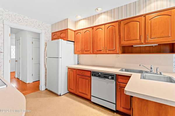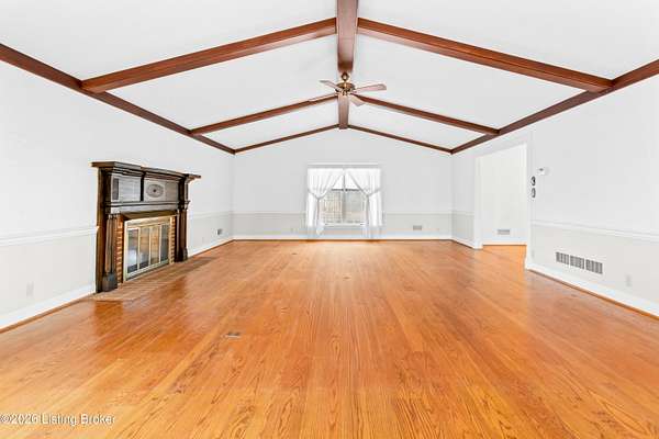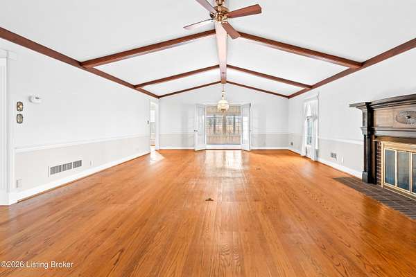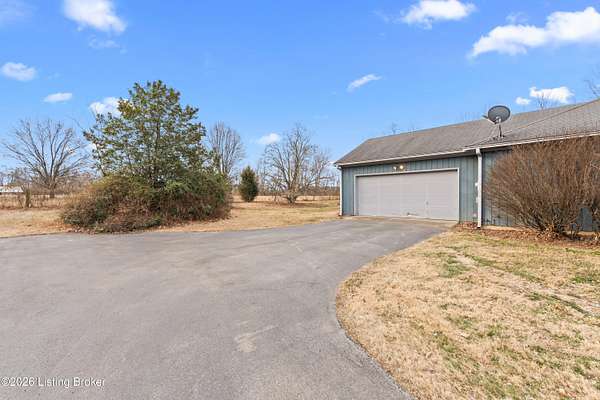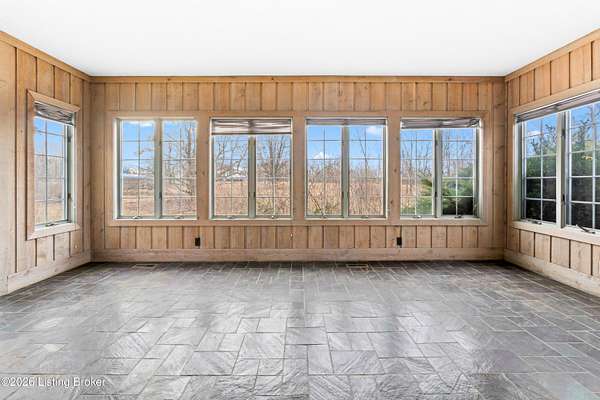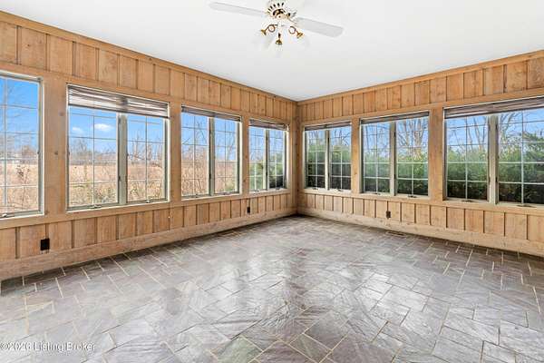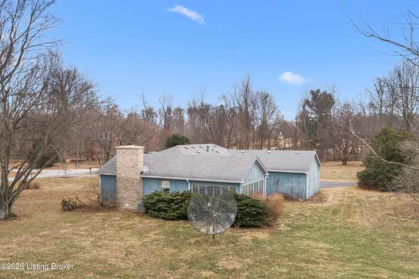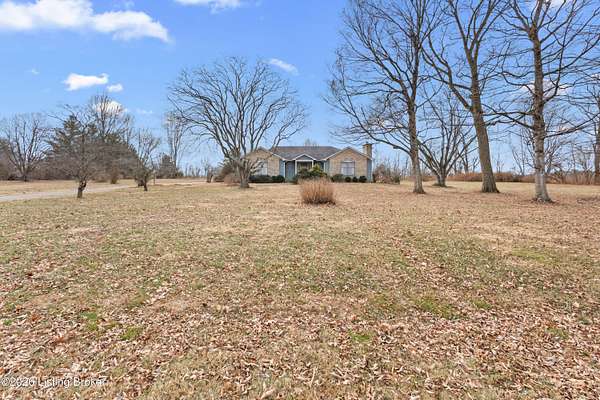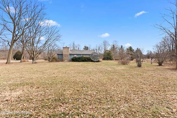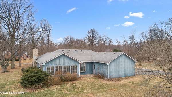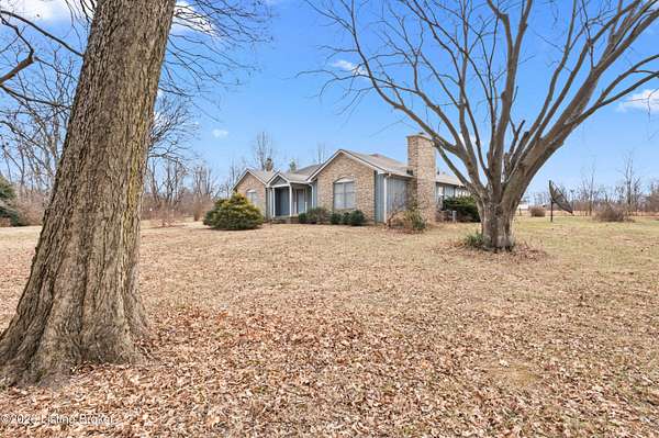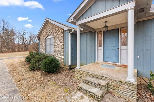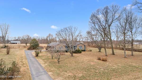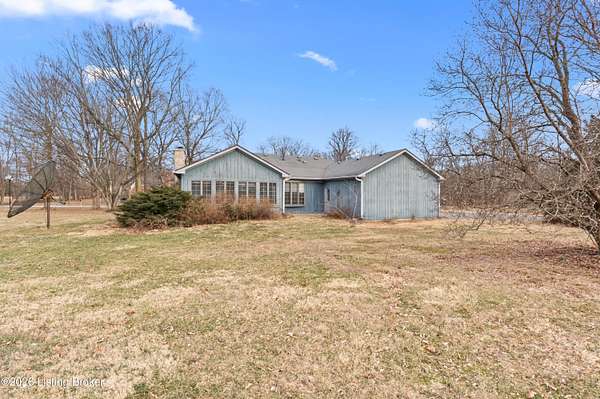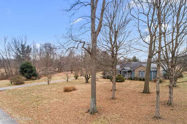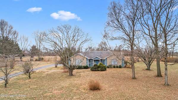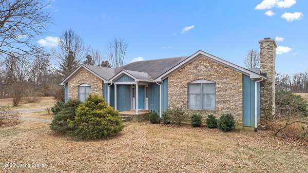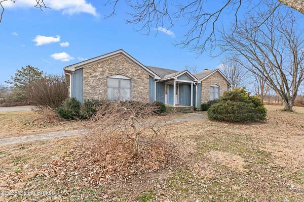 Set on 2+ scenic acres in the peaceful neighborhood of Shiloh Farms, this thoughtfully designed rustic ranch-style residence presents a rare opportunity to own a quaint home in the highly coveted North Oldham County School District. Built in 1985 and enhanced by a partial stone facade, the home was lovingly maintained and enjoyed by one owner. (The property may be eligible to be subdivided and potentially sold independently by the purchaser, subject to Planning and Zoning approval.) A picturesque stone walkway leads to the front entrance, opening into a large one-story foyer with exquisite hardwood flooring that flows seamlessly into the main living spaces. The impressive gathering room is highlighted by a vaulted ceiling, exposed beams, and a striking wood-burning fireplace, crowned with an intricately carved wood mantel. Enjoy abundance in an almost 590 sq ft space which is rich in architectural character and timeless appeal. The kitchen features a sizable bay window in the breakfast nook, quality wood cabinetry and a functional galley layout lends itself to an efficient design, offering exceptional potential for customization to suit today's lifestyle. A convenient laundry closet is located just off the garage adjacent to the kitchen, while generous storage closets throughout the home enhance everyday livability. Surrounded by walls of windows, the captivating sunporch features a slate floor and an expansive presence at 15' x 20', accessible from both the kitchen and gathering room. This light-filled space offers tranquil views of the grounds making it ideal for morning coffee. The primary suite is generously sized, featuring a tray ceiling, hardwood floors, spacious walk-in closet, and ensuite bath. The secondary bedroom is well-appointed with two large closets. In the adjacent hallway a full bath with walk-in tub adds versatility and accessibility. Additional highlights include a two-car attached garage and an unfinished lower level with a water proofing system and 3 sump pumps for added peace of mind. The excellent ceiling height presents exceptional potential for future expansion. Offered as an estate sale and conveyed AS-IS, this property represents a truly exceptional opportunity for discerning buyers seeking acreage, privacy, and long-term investment potential in one of Oldham County's most desirable locations.