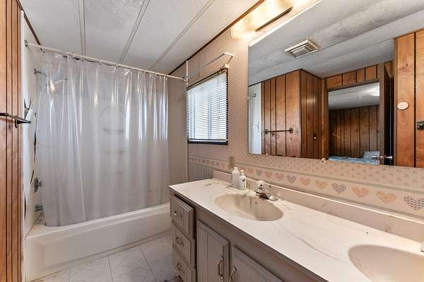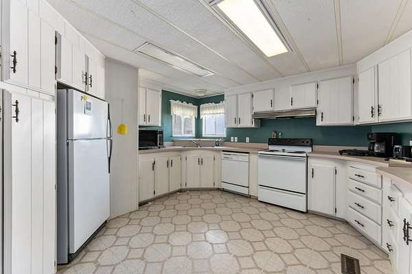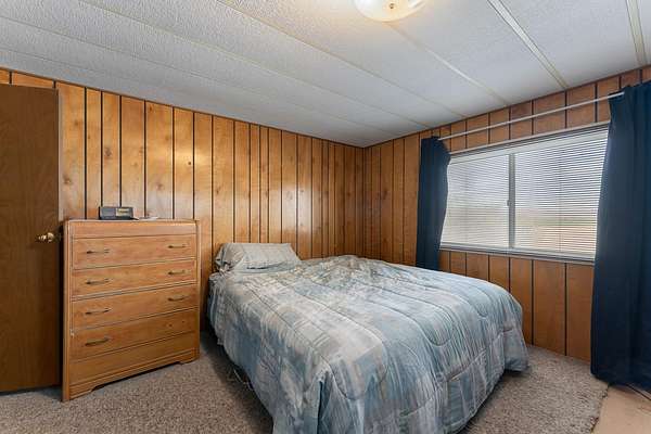 The property includes a modest 1,620-square-foot manufactured home with three bedrooms and two bathrooms, a 680-square-foot detached garage, and a spacious 50 x 60-foot shop with a concrete floor.