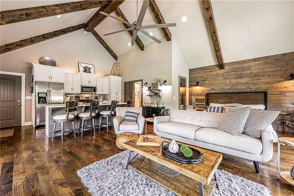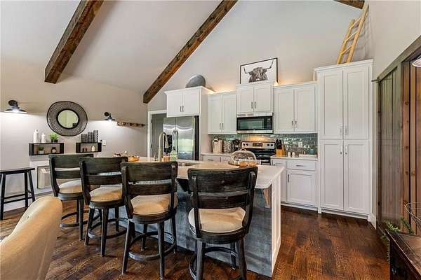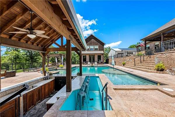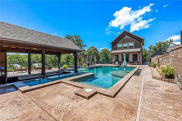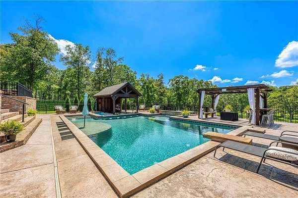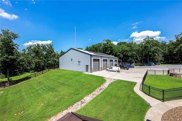 Luxury, privacy, & year-round beauty, minutes from Bentonville. 19.8 +/- acres. Fully furnished, 5 bed, 4 bath main residence features 4,220 SF w/ dedicated office, theater room. Gourmet kitchen boasts custom cabinets, center island, granite countertops, double oven, 2 walk-in pantries. Primary suite includes trey, lighted ceilings, spa-like ensuite bath, closet open to laundry room. Trifold glass living room wall opens to covered, retractable, fully motorized terrace. Fully fenced in-ground pool includes swim-up bar & waterfalls. 672 SF detached, loft style apartment offers rental opportunities & 672 SF furnished gym space. 4800 SF shop; 2 car lifts, 2 pull-through bays, & solar panels. Outdoors; fire pit, hot tub, chicken coop, green house, stocked fishpond, pasture for small livestock. Home on front 10 +/- acres. Remaining 10 +/- acres includes new road access, detention pond w/ development potential for multiple home sites, water & electricity close. Centerton water, private line. Well serves sprinkler system.