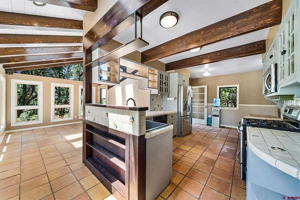 Rebecca Parnell, Bayfield Realty, C: 970-799-6556, Rebecca@BayfieldRealty.com, www.crenmls.com: Welcome to your own slice of paradise on this peaceful and picturesque 37-acre ranch, surrounded by breathtaking mountain vistas. Main home, guest home, barns, corrals, arenas, greenhouse/lodge, fenced space for dogs and free propane all located less than 10 minutes from Bayfield! As you enter the main home through a private lock-off entry, you're greeted by a warm and inviting kitchen featuring classic Saltillo tile flooring, a cozy woodstove, and a spacious walk-in pantry. It's the perfect spot to savor your morning coffee while taking in the serene surroundings. Just off the kitchen, the dining room offers large windows that frame stunning views, creating a space so welcoming you won't want to leave. The oversized living room continues the theme of comfort and light, with more expansive windows, built-in seating, and a rustic wood-burning fireplace--ideal for relaxing evenings or gathering with friends and family.A conveniently located bathroom and a versatile adjoining room--perfect for a home office or studio with its own private entrance--complete the main floor. Upstairs, you'll find a spacious primary bedroom with a generous walk-in closet, two additional bedrooms, a second full bathroom, and an abundance of storage throughout. The beautifully remodeled guest house has been thoughtfully updated with modern comforts while preserving unique character. Featuring brand-new plumbing, windows, doors, and electrical wiring, the home blends functionality with charm. A striking stained-glass window--transported all the way from the East Coast--serves as a captivating focal point, visible from the entry, kitchen, and living room. The main level offers a welcoming living area, an open kitchen and dining space, a half bathroom, and a convenient laundry room. Upstairs, retreat to the cozy bedroom with its own private, covered deck--the perfect spot to unwind and take in the peaceful views. An attached bathroom with a window seat offers a serene space to relax and recharge.Outside, the possibilities are endless. There's ample room for gardening, animals, and outdoor exploration. The greenhouse is a combination space offering something for everyone. On one side there is a game room with pool table, air hockey, and storage, while on the other you have a greenhouse and a separate room with sink that would be perfect for washing veggies and preparing canned goods. This space has water, heat, 220 electric and could easily be turned into a studio, workshop, or home office if desired. For horse and animal lovers, the property also includes a large arena, two barns with a tack room, feed storage, and multiple corrals--making it a fully functional ranch ready for your animals and dreams. Whether you're looking for a peaceful retreat or a place to create your dream homestead, this one-of-a-kind property offers beauty, comfort, and endless potential.