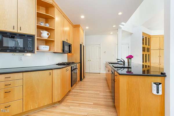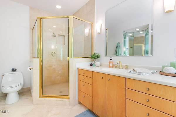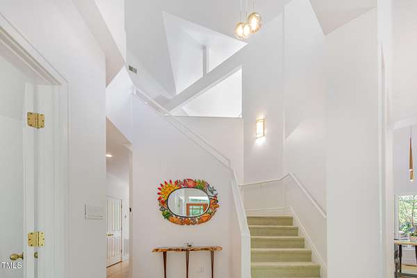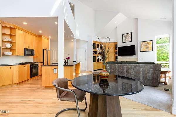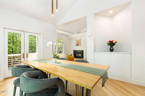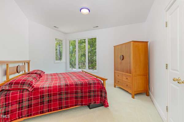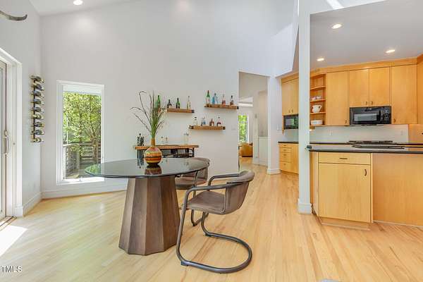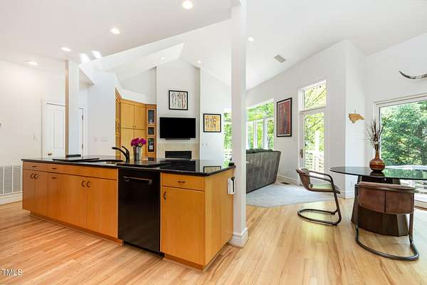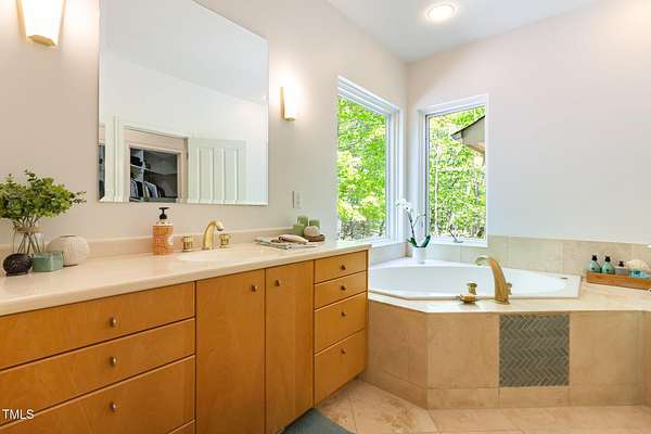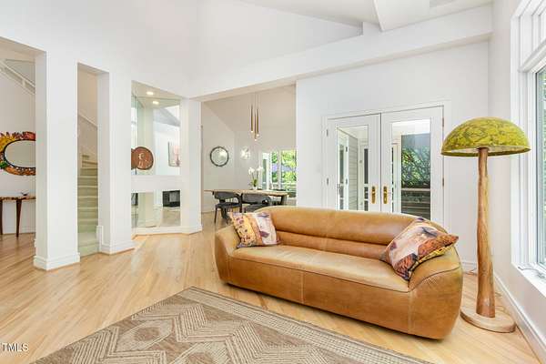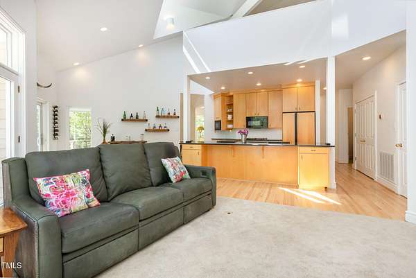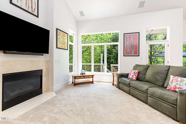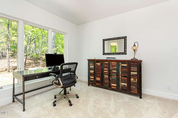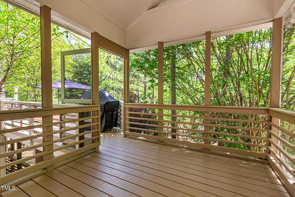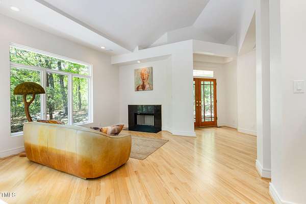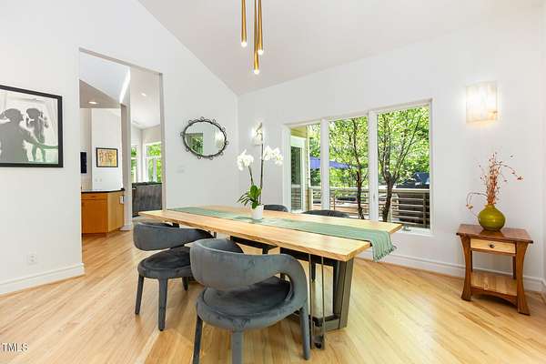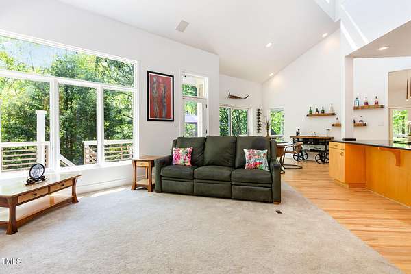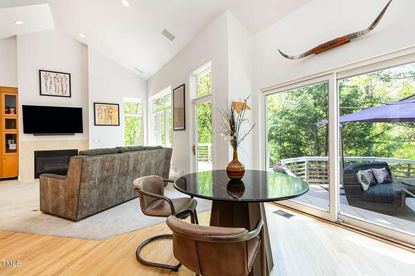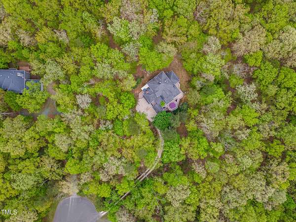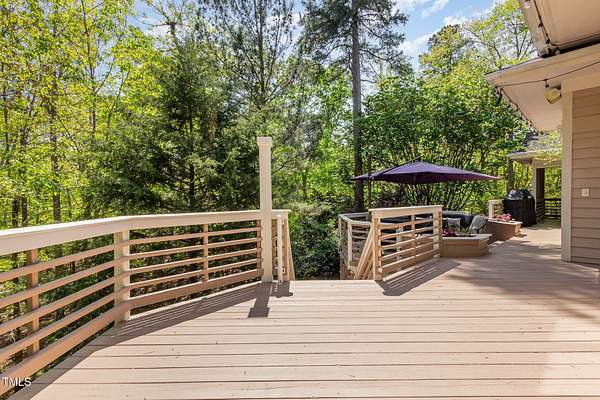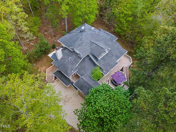 Amazing custom-built home in Chapel Hill with Chapel Hill Schools, perched atop a boulder-studded hill on nearly 2.5 acres and surrounded by old-growth hardwoods-offering privacy, exclusivity, and serenity with a prime location. Just 15 minutes to UNC-Chapel Hill and Duke University, 25 minutes to RDU, and 40 minutes to Raleigh. This contemporary, open-concept home is filled with natural light from expansive Pella casement windows, full-height glass doors, and dramatic crescent-shaped double-pane windows that draw the eye upward to the striking 30-foot angular ceiling in the central living space. The main-level owner's suite features bay windows overlooking a lush forest and private access to a two-story, wrap-around deck. The spacious bath includes a two-person jetted tub, oversized walk-in shower, and dual vanities. The airy kitchen offers solid maple cabinetry, a new gas range, built-in oven, paneled refrigerator, and an oversized black granite bar overlooking the den and family room. Walls of windows and doors open to an elevated deck seating area, placing you eye-level in a canopy of trees-perfect for entertaining or quiet relaxation. Additional highlights include a quiet front office ideal for working from home, two additional bedrooms and a full bath with loft area on the second floor, and a large finished basement ideal for a family room, teen suite, mother-in-law suite, gym, or secondary office with direct exterior access. A whole-house generator adds peace of mind. Tour this impressive home and imagine the possibilities.