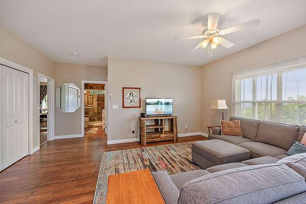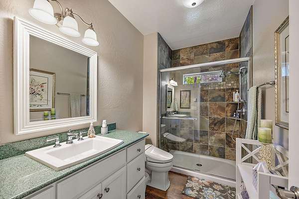 - Breakfast Bar, Built-In Features, Ceiling Fan(s), Double Vanity, Enclosed Toilet(s), Granite Counters, Kitchen Island, Laminate Counters, Linen Closet, Open Floorplan, Pantry, Primary Downstairs, Shower/Tub Combo, Smart Thermostat, Soaking Tub, Tile Shower, Walk-In Closet(s)