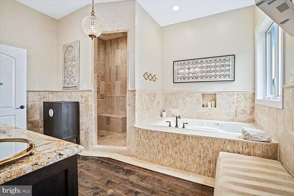 - Ceiling Fan(s), Crown Moldings, Entry Level Bedroom, Exposed Beams, Family Room Off Kitchen, Formal/Separate Dining Room, Gourmet Kitchen, Island Kitchen, Open Floor Plan, Pantry, Primary Bath(s), Recessed Lighting, Skylight(s), Soaking Tub Bathroom, Stall Shower Bathroom, Upgraded Countertops, Walk-In Closet(s), Wine Storage, Wood Floors