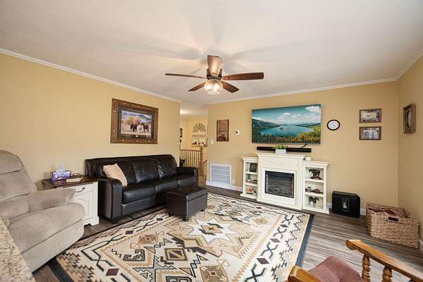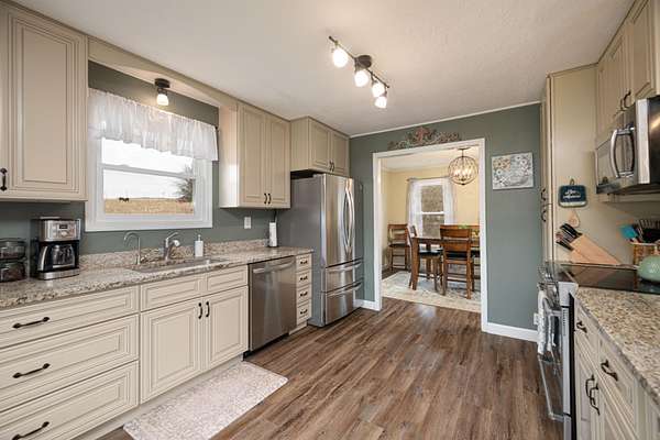 The home includes 3 bedrooms, 2 baths, and approximately 2,334+- sq ft including a finished basement. Updated kitchen with stainless steel appliances. AquaSauna whole-home water filtration system, EcoFlow power backup system, encapsulated crawl space, and leaf gutter guards already in place. Large deck overlooking the countryside.