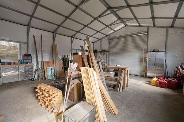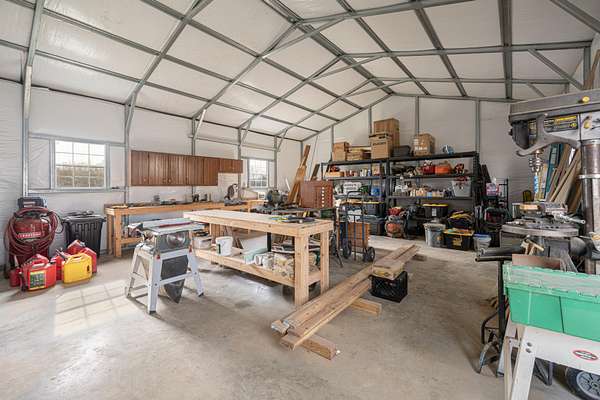 The land is fully functional and thoughtfully improved. Private pond with dock stocked with bass, bluegill, and shellcracker bluegill. Creek frontage. Raised garden beds with drip irrigation. Mature asparagus, garlic, black and red raspberries, walnut tree, and 3 pecan trees. Chicken coop, pole barn, equipment shed/stable, additional utility shed, cement driveway, stone sidewalks, and insulated 24' x 30' garage/workshop.