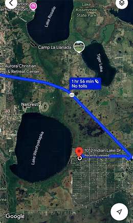 Continue on FL-60 W/State Rd 60 W. Drive to Ind. Lake Dr in Ind. Lake Estates 34 min (31.2 mi) Merge onto FL-60 W/State Rd 60 W 27.8 mi Turn left onto Deland Ave 0.3 mi Turn right onto Park Ave 2.9 mi Turn left onto Lakeview Dr 0.1 mi Turn right at the 1st cross street onto Ind. Lake Dr.