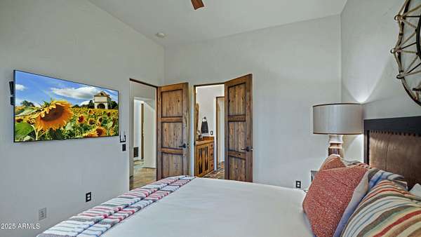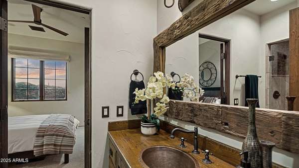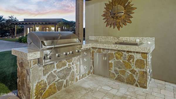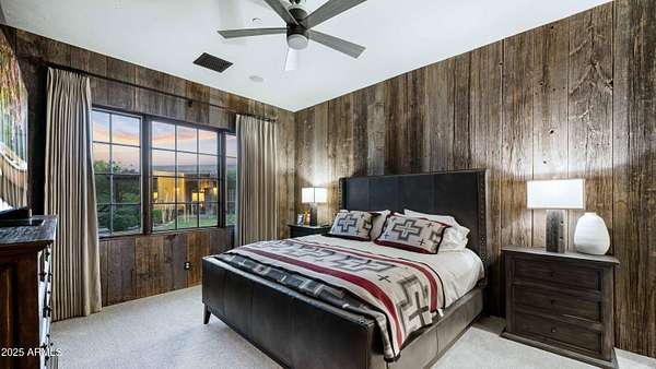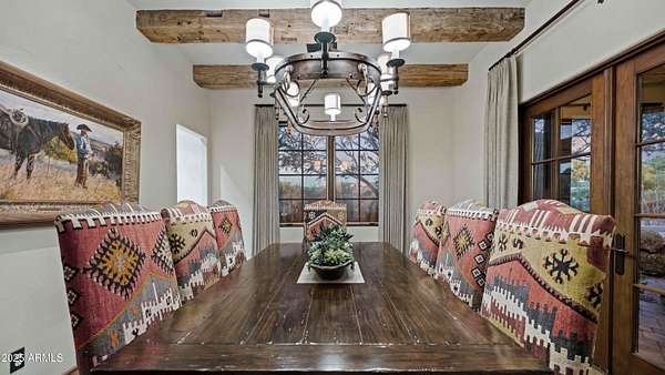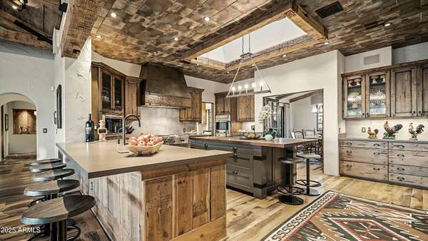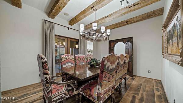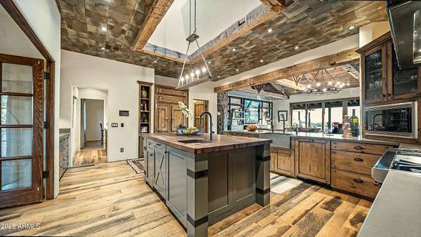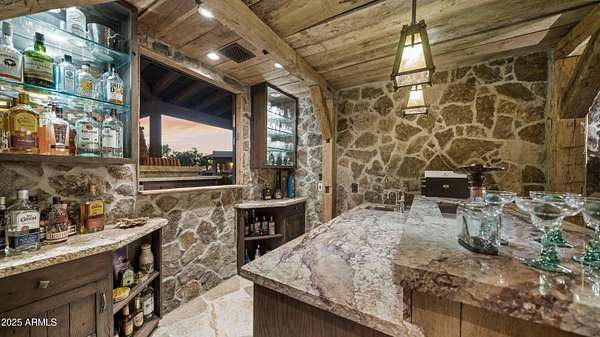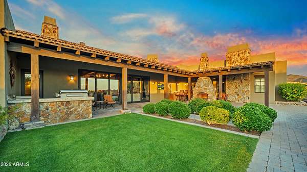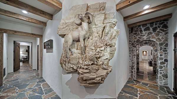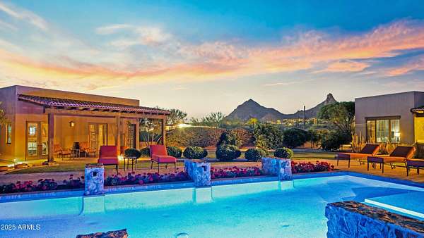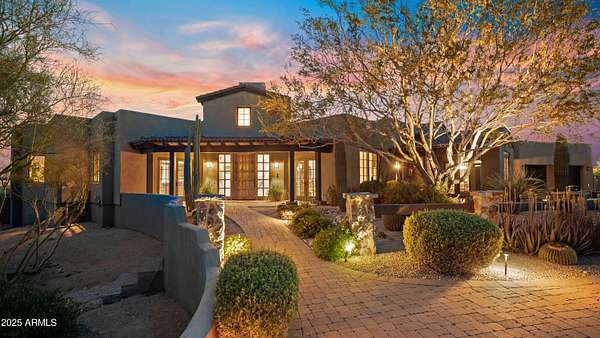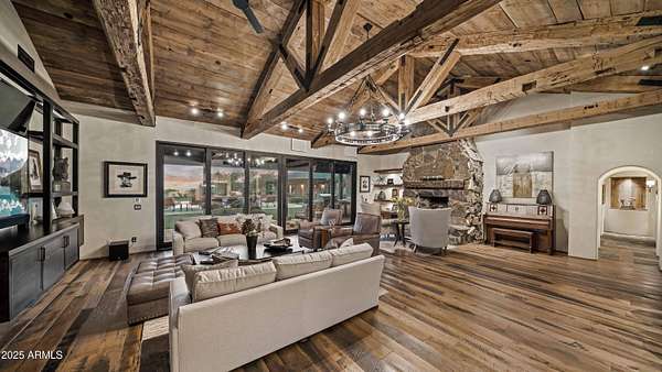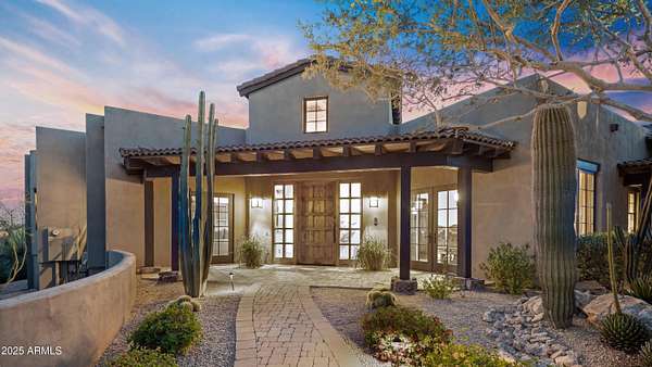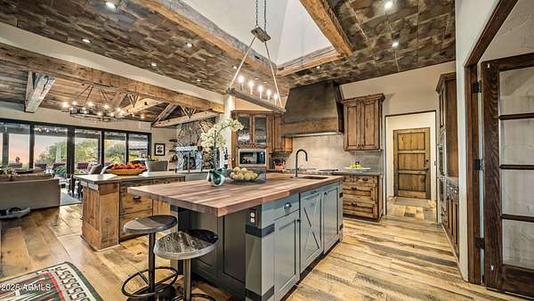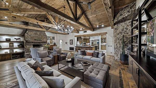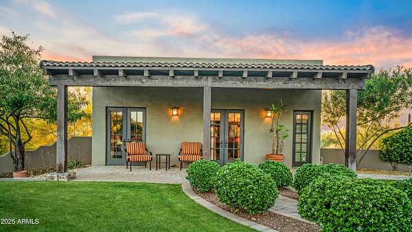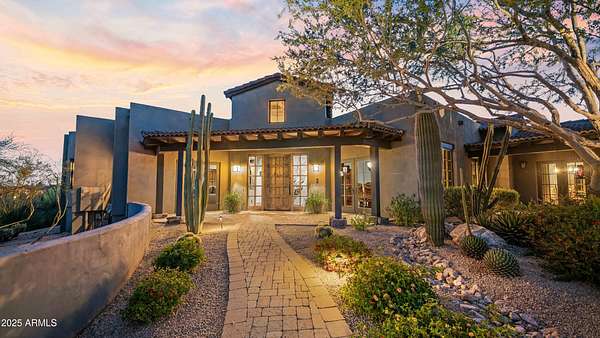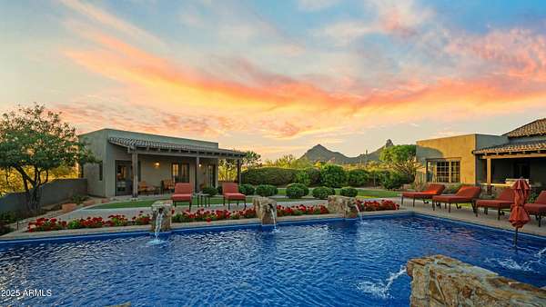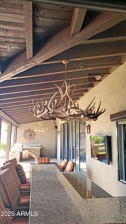 An Exquisite single level home for the discriminating buyers seeking exceptional quality of construction, unsurpassed architectural details and only the finest finishes. The Kitchen and bathrooms were remodeled, however a 100+ year old CO Barn was disassembled and masterfully repurposed for the wood beam ceilings, the distressed reclaimed hardwood floors, flawless 2nd bedroom reclaimed wood walls. This, along with the stamped copper ceiling in the office, the stone accents in the alcove, the massive rock fireplace, the real antler chandeliers and remarkable one of kind Cave Den Bar give this home an 1800's AZ authenticity & uniqueness that cannot be duplicated. It is an entertainer's dream home with every amenity to spoil family & friends. The stunning super private backyard has Dream Home with every amenity to spoil family & friends. The stunning super private backyard has breathtaking mountain views everywhere, large heated pool, BBQ, fireplace, firepit and multiple lounging & forever green grass areas for pets and children to romp. Your guests will enjoy the generous separate casita with Views, Euro-Kitchen, walk-in closet & washer/dryer. The current Bunk Bedroom has a magical star-lite ceiling, sleeps eight, terrific for sleep-overs & grandchildren. It can be converted back to a star-lite theater. The current owner has upgraded and/or replaced most everything mechanical, including the roof in 2023 with 10 Year Warranty, HVAC's in 2023, Tank-less water heaters in 2022, all new Crestron System 2024-2025, New Jandy 400 BTU Pool Heater & Water Feature pump in 2024 & MUCH more making this an all but new functioning home (SEE HOME SELLER'S HOME EXTENSIVE IMPROVEMENT LIST IN "DOCUMENTS". Two Plus Acre parcel leaves plenty of room to expand garages &/Or home. This One-Off Authentic Hacienda is a work of art like no other. In Scottsdale's gated Ladera Vista community. This home checks every box. Bring your Cowboy Boots!