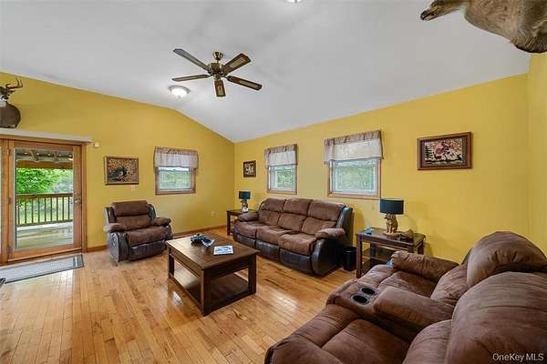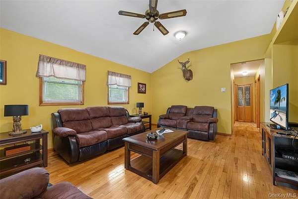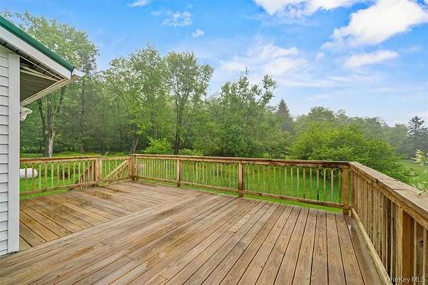 Welcome to this well-maintained 3-bedroom, 2-bath ranch home set on 1.5 peaceful acres in Parksville, New York, located in desirable Sullivan County. This inviting home offers a spacious layout featuring hardwood floors, an open living room and dining room combination, and an eat-in kitchen with glass sliders leading to an oversized wraparound deck-perfect for relaxing or entertaining. The deck is partially covered for shade while the open section enjoys full sun and beautiful outdoor views. The main level includes three generously sized bedrooms and two full bathrooms, providing comfortable living space for family or guests. The full walk-out basement is dry and unfinished, offering a tremendous amount of storage space, laundry area, and excellent potential for future expansion. A one-car garage adds additional convenience. Ideally located near the charming towns of Livingston Manor and Roscoe, known for nature lovers, dining, breweries, and shopping, and just a short drive to Garnet Health Medical Center- Catskills. Enjoy everything the Catskills region has to offer including Hemlock Falls Camping, Hunter Lake Camping, local farms and animal sanctuaries, hiking trails, Bethel Woods Center for the Arts, Resorts World Casino, Kartrite Water Park in Monticello, and more. Whether you are looking for a full-time residence, weekend retreat, or summer getaway, this property offers comfort, privacy, and a great location. Pride of ownership shows throughout this well-kept home.