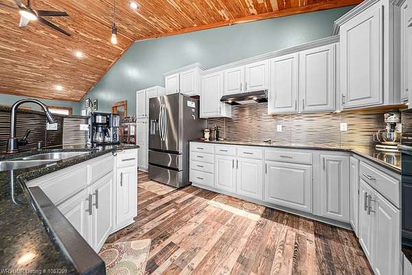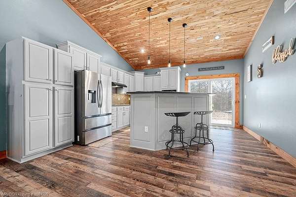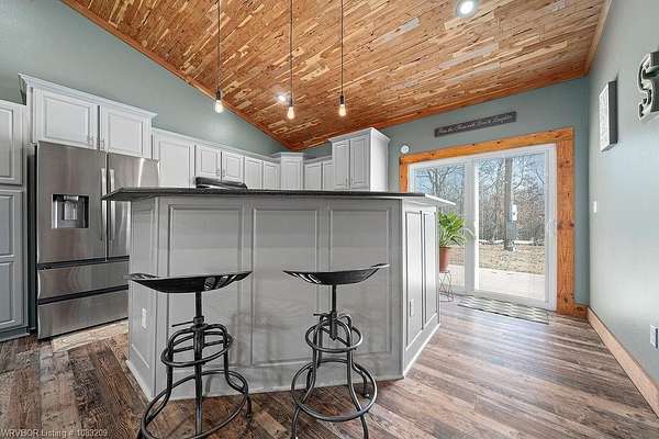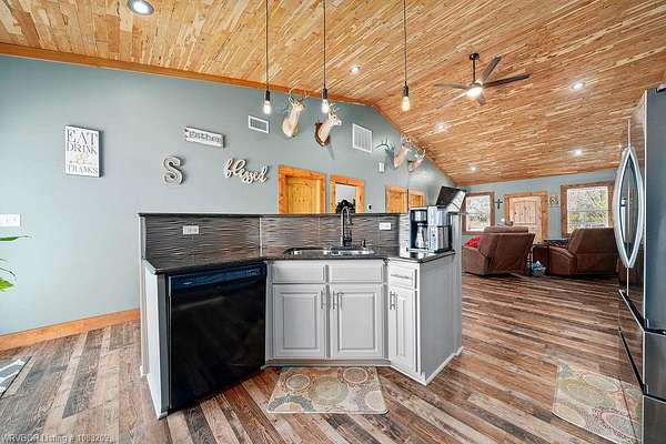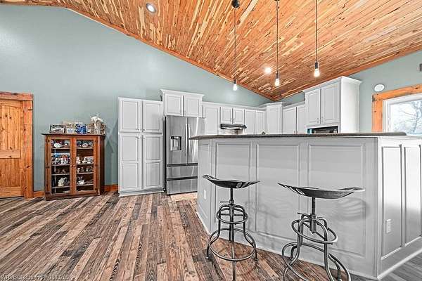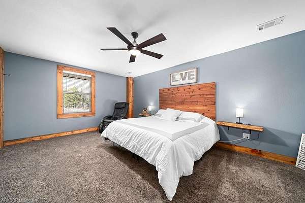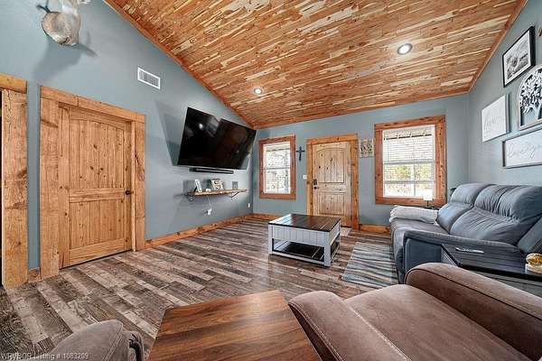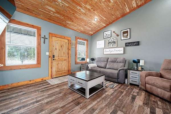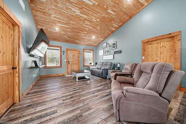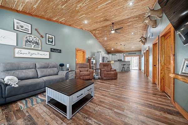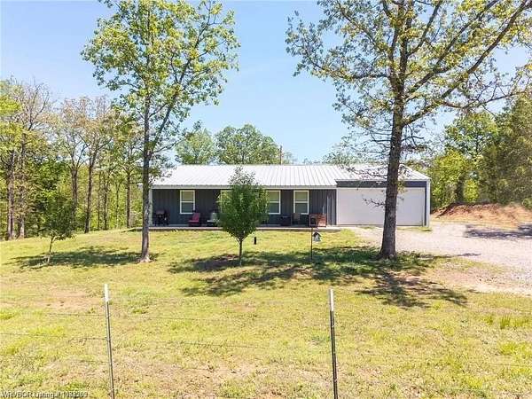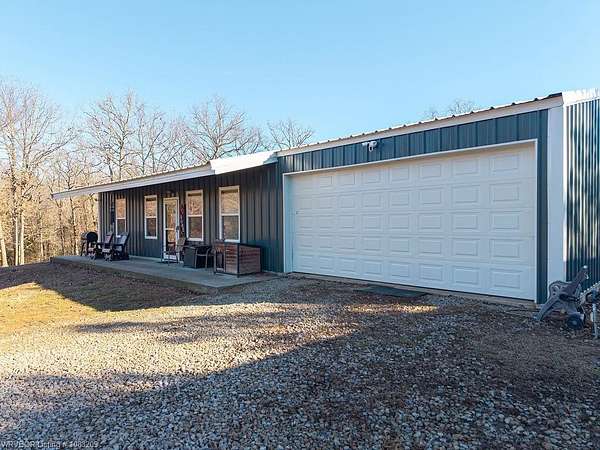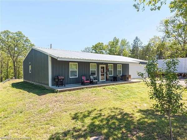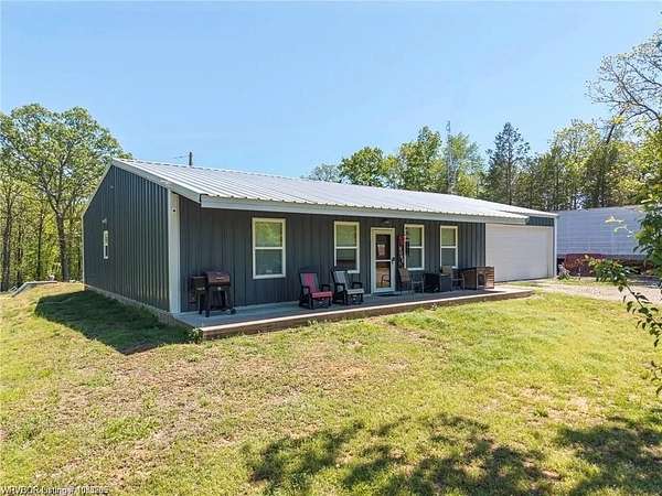 Introducing a stunning red iron-built metal home featuring 3 bedrooms and 2 bathrooms, set on approximately 29.91 acres with an all-weather creek on the land. Much of the land is covered with mature trees, creating an ideal habitat for deer, turkey, and a variety of wildlife. The inviting covered front porch is perfect for enjoying morning coffee while taking in the beautiful surroundings. This robust structure boasts an open-concept layout enriched with rough cedar and pine, enhancing the natural ambiance throughout. The kitchen cabinets are equipped with pull-out drawers and a Lazy Susan, maximizing storage space efficiently. The main living areas are adorned with waterproof vinyl flooring, while the bedrooms feature cozy carpeting. A 2-car attached garage, 1 car detached carport is included with the property, along with an open back patio and a cellar in the backyard. Additionally, fiber optic high-speed internet is now accessible at this location.