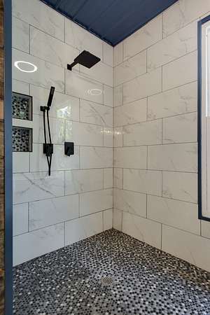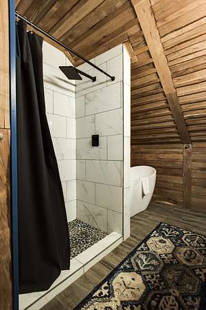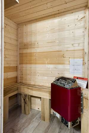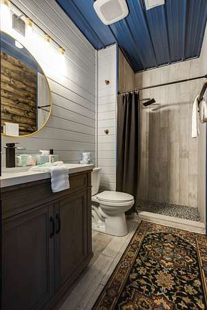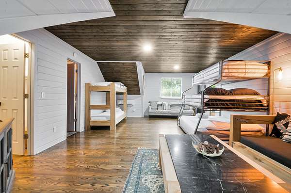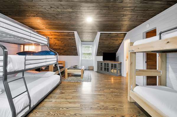 The home offers 3 large bedrooms (including primary) on the main level, with a bonus/playroom and bunk room upstairs. Every bedroom has its own private porch. The primary suite includes a sauna, and the living space opens up to a pool, hot tub, and panoramic water views.