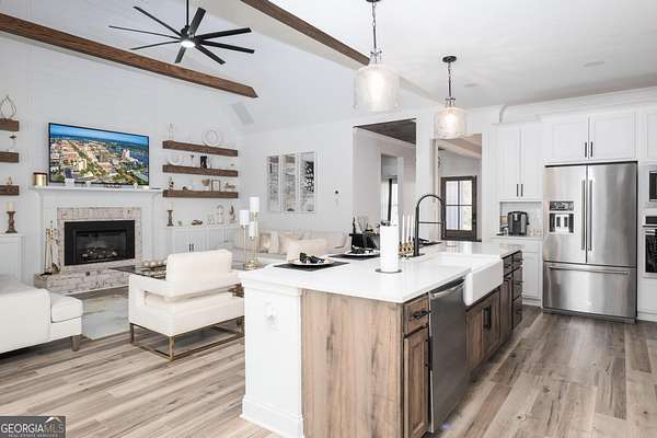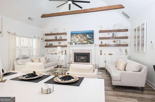 WELCOME HOME !! This LIKE-NEW home has it all!!! This 4bdrm/ 3 bth + media room nearly new craftsman style home; built in 2024 - Remarkably Maintained- situated on over 2+ acres gated. As you step into this open floor plan you'll be met with an accent ceiling and a accent wall. The Master suite is conveniently located on the main level of the home with an additional bedroom, A delightful chef style kitchen, a large island with quartz counter-top, a subway tile backsplash and a dry-bar great for entertaining your guests. The Spacious living room offers custom cabinets with floating shelves with a fireplace. On the second floor you will find two additional bedrooms, a full bathroom You will also find a generous size large media room perfect for a gam e room, man-cave, or it can be converted into a 5th bedroom. Outside you'll also be greeted with a screen-in patio with a wood burning fireplace, a ceiling fan. This is a MUST SEE!! Schedule your showing today! Please note -"Seller/Agent'", hold an active real estate license GA R.E. Lic. # 376199