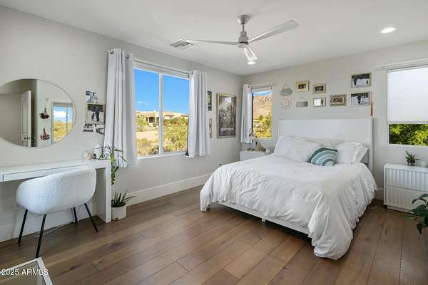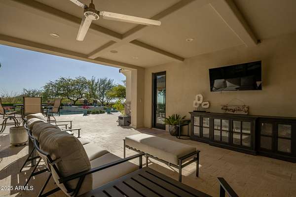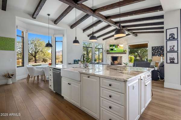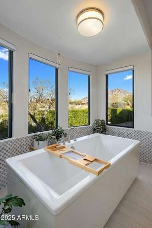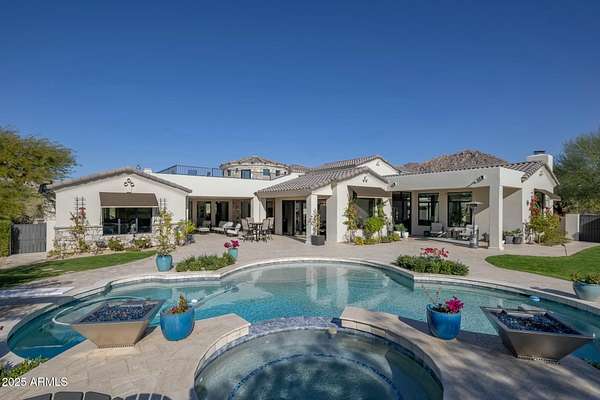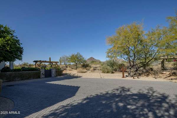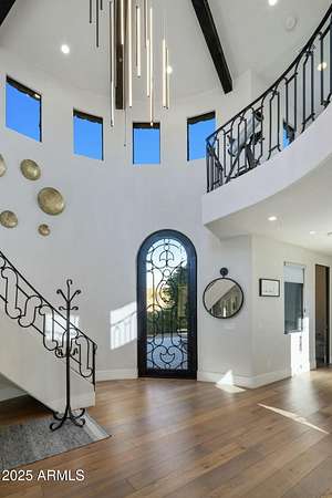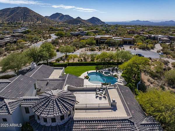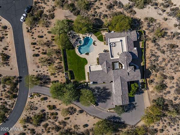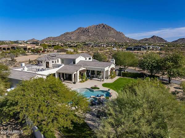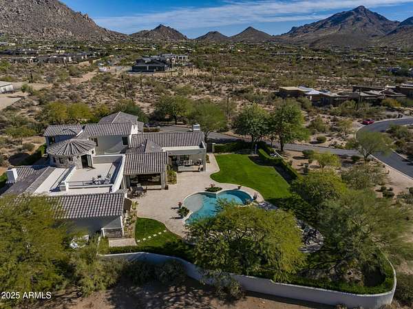 Private estate with 360 degree views on a 2.5 acre lot in the gated community of Ladera Vista. Remodeled in 2020, sits 4 bedrooms with 4.5 baths, plus an office, second family room and bonus room with a total of 5,509 sqft. The property captures views of the McDowell Mountains, Troon Mountain and Pinnacle Peak out any of the floor to ceiling windows or the multiple glass sliding walls throughout the home that brings to life the indoor/outdoor living. The kitchen sets the focus with custom cabinetry, JennAir and Subzero appliances, double ovens, gas cooktop, oversized kitchen island and a custom stone wall fireplace leading into the formal living room. A walk-in pantry separates your kitchen from your formal dining room which also has its own butler's pantry perfect for hosting. The downstairs master bedroom showcases views of the Southwest and is oversized to accommodate the sitting room and gas fireplace. The primary bathroom features double vanities, soaking tub, with wood and tile flooring throughout. Powder bath, two offices, second formal living space and another ensuite bedroom with French doors are all downstairs. Step up the hand forged spiral staircase to two more ensuite bedrooms, loft and an additional bonus room. Rooftop deck has sweeping views and captures the city lights at night! Dip in your spa that overflows into your heated pool, which features a Baja deck and fire pit with large mature trees and Ficus for extra privacy surrounding. The multiple covered patios make entertaining seamless. The 4-car garage is temperature controlled with built in cabinets for extra storage. Quick 5 minutes to Scottsdale Quarter, Kierland and local grocery store AJ's Fine Foods. Minutes away from Pinnacle Peak and Tom's Thumb Trailhead.