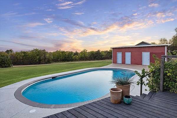 The private primary suite opens to a side porch with direct access to the inviting pool area and its accompanying facilities, perfect for relaxed entertaining. An additional vintage outbuilding provides flexible space for equipment storage or a workshop.
