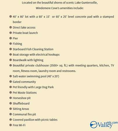 RV Lot! Furnished Gazebo & Golf Cart included! Needing a lake getaway? Don't miss this deeded RV lot at Windemere Cove! Located in a gated waterfront RV community on the shores of Lake Guntersville. Extra large concreate pad ready for an RV. Nice storage shed - This property gives owners exclusive access to a private boat launch, 2 docks, boat tie ups, waterfront board walk, fish cleaning station, lakeside fire pit, dog park and walking trails. Club house features an inground swimming pool, large kitchen, gathering room, gym, game room, and bathrooms with showers. All RV's must be less than 10 years of age and no less than 26ft. HOA $190/ mth
