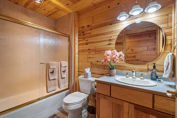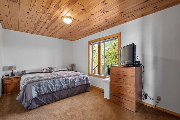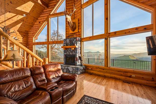 The main floor features an elegant rock fireplace between the towering chalet windows, an open design living space, dining room, & kitchen that overlook the valley below and are bathed in sunlight, creating a natural warmth in the home. Rounding out the main floor are two guest bedrooms, one with deck access, the full guest bath, laundry, and attached garage; the garage is 2 car width and roughly one and a half times standard depth, leaving ample room.