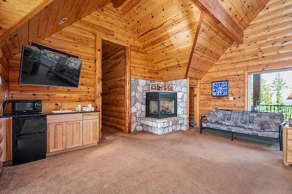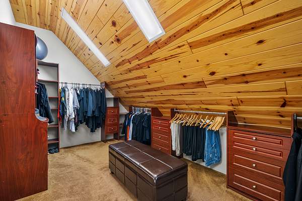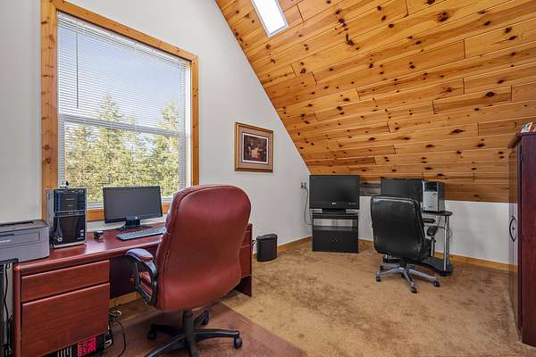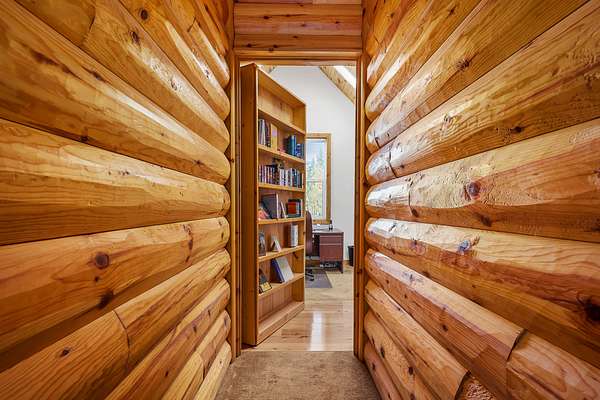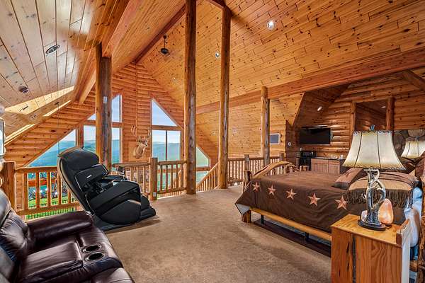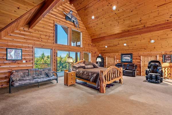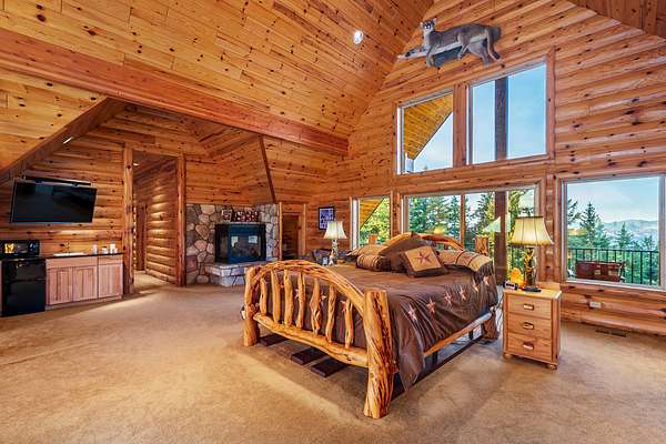 A lodgepole staircase leads up to the master suite - at this level you get yet another vantage point of the views to the south as well as a private deck to enjoy the view to the north. The large master suite includes grand amenities, including a kitchenette, master bath, walk-in closet, private balcony, and even a secret office.