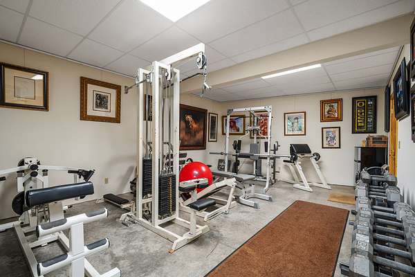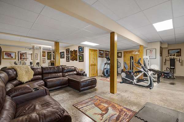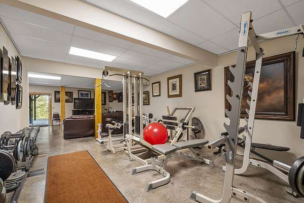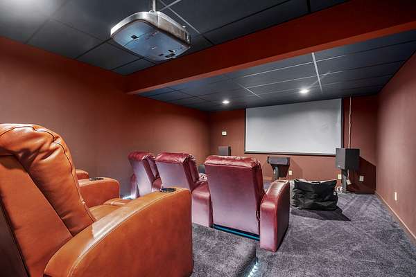 Downstairs to the daylight basement, you will find an in-home movie theater as well as a large multi-purpose room with sliding glass doors to the exterior. The large open space is currently used as a family area and host to a home gym - it has potential for many uses. Other features include a geothermal heating and cooling, three gas fireplaces, starlink internet and more.