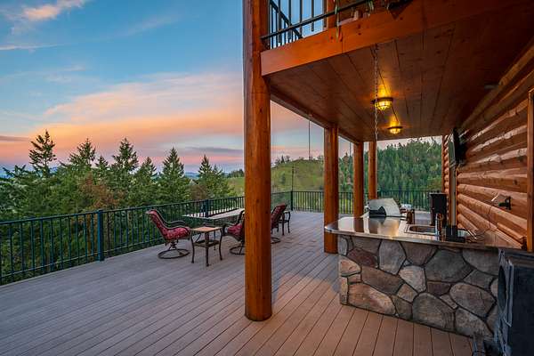 A wraparound deck and concrete patio are also off of the main level, situated to partake in the southern view; with access from the kitchen it adds stunning entertainment space - it is beautifully lit as well, lighting has been installed in the eaves surrounding the home making for both a pleasing aesthetic as well as space that can be utilized well into the summer evenings. The north facing deck is covered and also has an outdoor kitchen space.