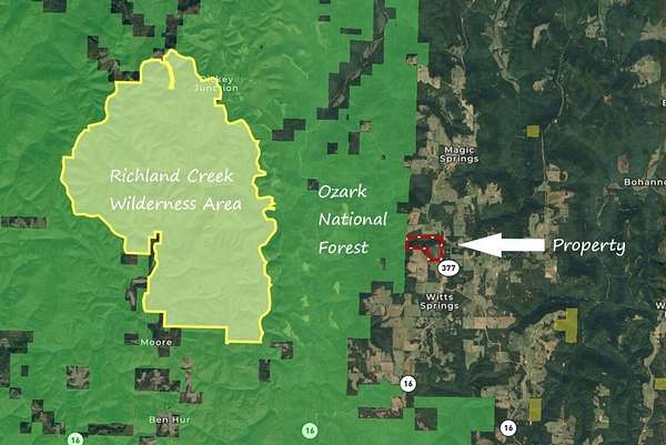 166 acres of prime hunting adjoing Ozark National Forest! Electric is on site and public water is on the entry road, making this a perfect spot to build your weekend getaway or hunting cabin. Pull just through the private gate to a flat clearing that would be a perfect spot to build, or drive a little up the hill to build with amazing views. A spring fed creek runs through the entire northern section of the property and is surrounded by over 100 acres of mature timber and beautiful rock bluffs. The steep terrain along the creek, paired with the roughly 60 acres of cut timber with thick, new growth is a perfect recipe for holding lots of wildlife. Don't forget the direct access to thousands of acres of National Forest ground on the Western property line. Just a quarter mile off the highway, the access can't get much easier to a property loaded with big deer, bear and turkey. Great trail system and newer perimeter fencing on a large portion. Buffalo River and Little Red River are both just a short drive away for floating and fishing!