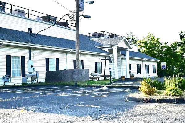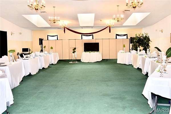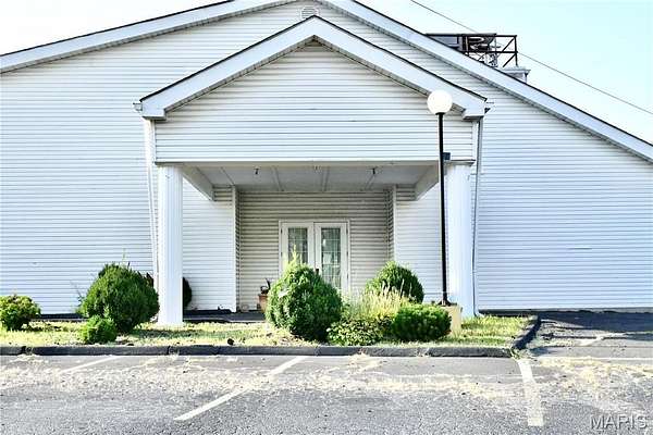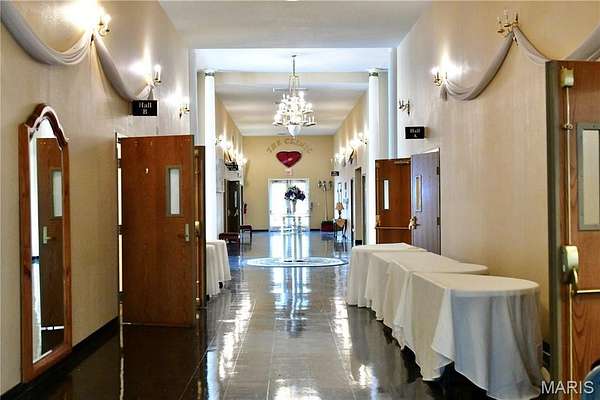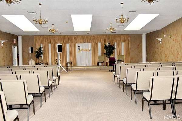 This 13,751 sq. ft. commercial church building, originally built in 1997 as a funeral home and thoughtfully converted into a church, offers a perfect blend of functionality and style. Situated on a landscaped lot with concrete walkways, driveway aprons, grassy areas, planter sections, and a semi-circular driveway with ground-controlled lighting and an identification sign, the property includes an asphalt parking lot for up to 100 vehicles, two concrete floodway retention basins, and a creek along the rear boundary separating the main parcel from additional land. The building features a vinyl siding exterior with brick veneer front, three attached canopies, two entrances, and climate control via a roof-mounted furnace and central air. Interior spaces include a 150-seat sanctuary with a brass and marble chandelier, black tiled flooring, and recessed and sconce lighting, a welcome center, kid center, bookstore, fellowship hall, two additional halls, main hallway, kitchen, executive office with half bath and shower, women's lounge, and men's bathroom. With 600 amp and 200 amp electrical service, this versatile property is ideal for religious organizations, community centers, event venues, or other commercial uses, combining excellent accessibility, extensive amenities, and a prime location on Four/Six Land Halls Ferry Road.