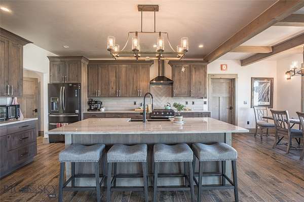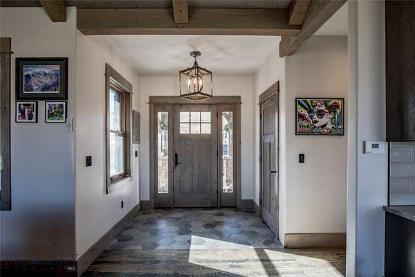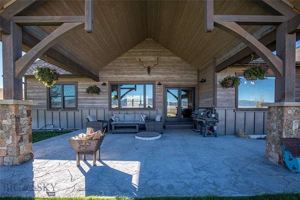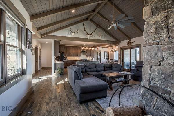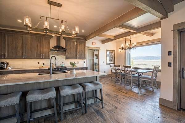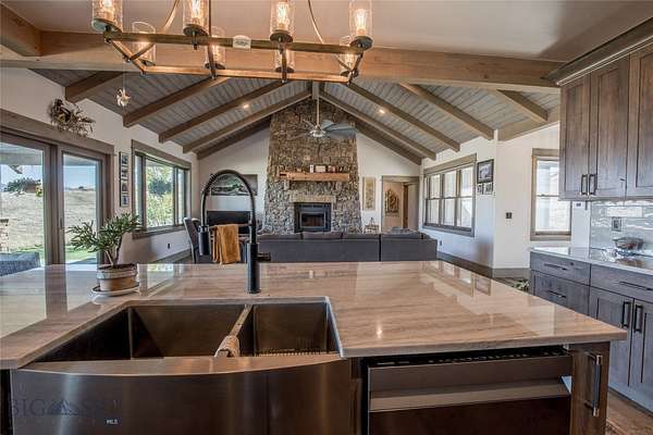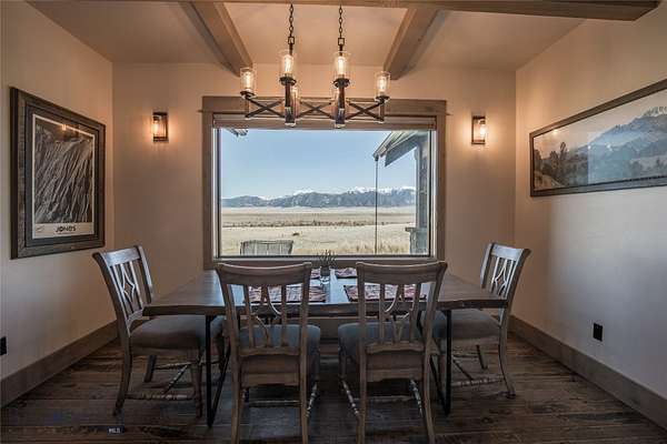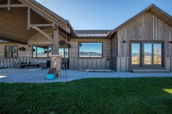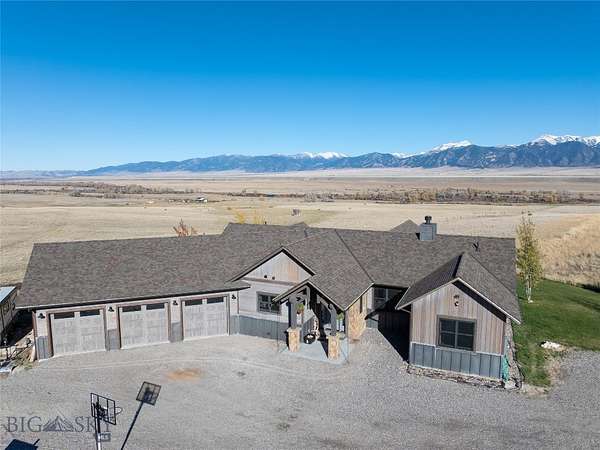 Unmatched views stretch from beyond Sphinx Mountain to Ennis Lake from this end-of-road setting overlooking the winding Madison River near Varney Bridge. Bordering a large family ranch, this 15.82-acre property offers privacy and quiet while remaining close to the amenities of Ennis. It is rare to find a home with such proximity to town and virtually no homes in the viewshed. This custom 3-bedroom, 2.5-bath home (approx. 2,377 SF) was built in 2020 by Sphinx Mountain Builders-known for combining rustic design with modern craftsmanship. Built by the builder for his own family, it features high-end finishes throughout, including skip-sawn, wire-brushed white oak floors and a floor-to-ceiling flat willow moss rock wood-burning fireplace. The kitchen includes hickory cabinets, quartzite countertops, a large island, and a gas stove, opening to the great room and dining area oriented to capture sweeping Madison Range views. The mudroom and laundry area provide generous storage and workspace. The primary suite offers an office area, double-sink vanity, large soaking tub, oversized shower, and walk-in closet. Two additional bedrooms and a guest bath are located at the opposite end of the home. Exterior materials include flat willow moss rock, Montana Timber Products siding, and steel wainscoting for durability and clean lines. A covered patio with stamped concrete and curved beams creates inviting outdoor living space, complemented by an irrigated lawn and mature trees. The finished three-bay garage provides ample space for vehicles and equipment. This is the first time this property has been offered for sale-an excellent opportunity to own a custom home in a premier Madison Valley location.