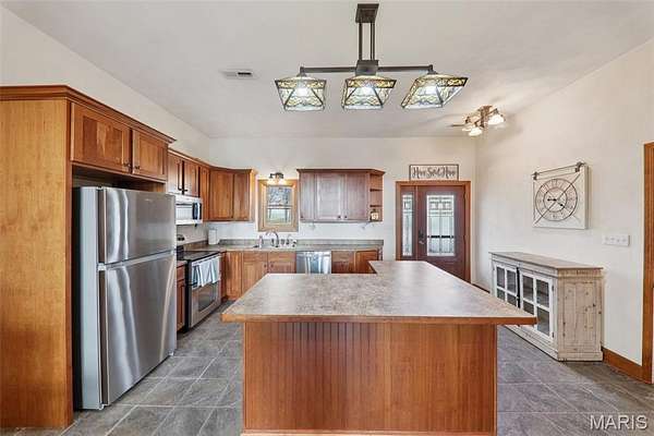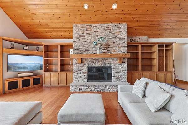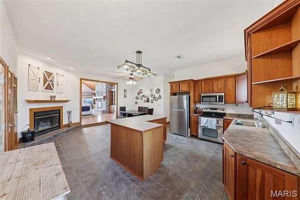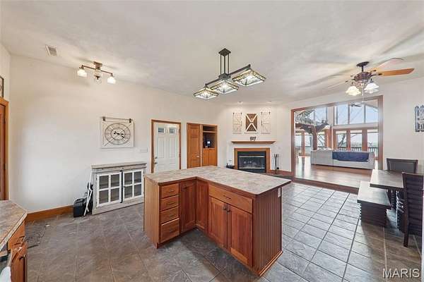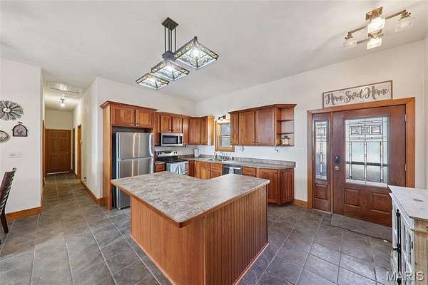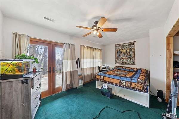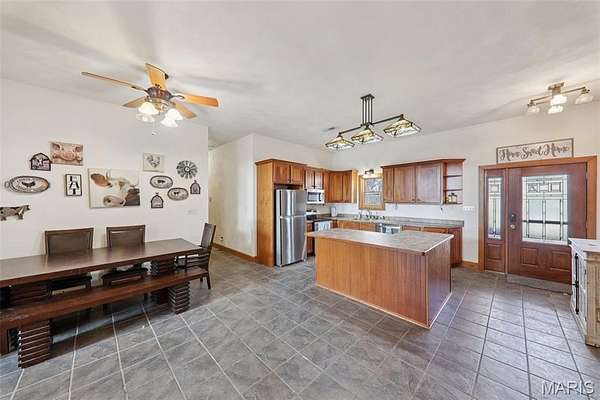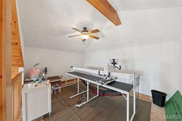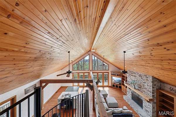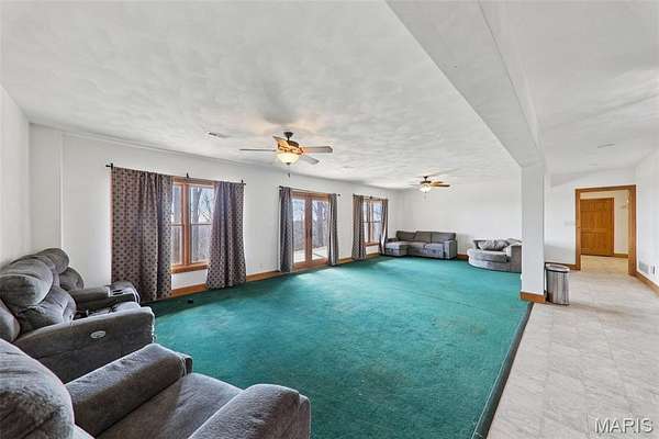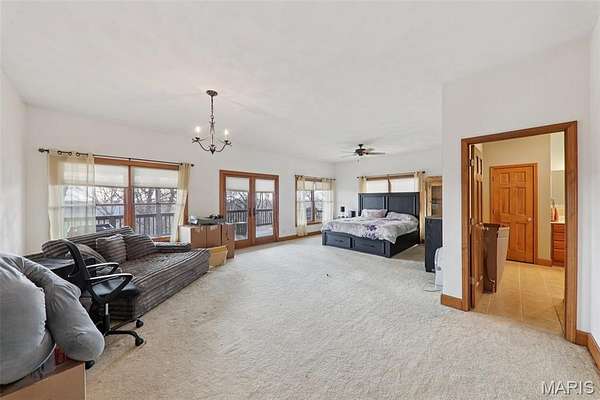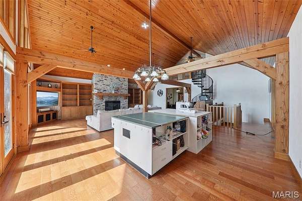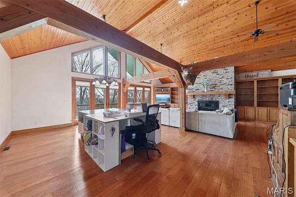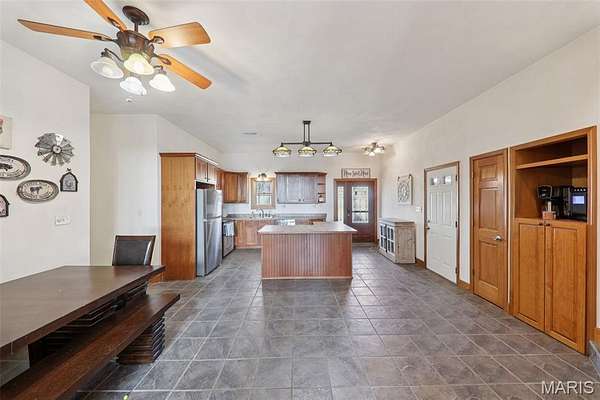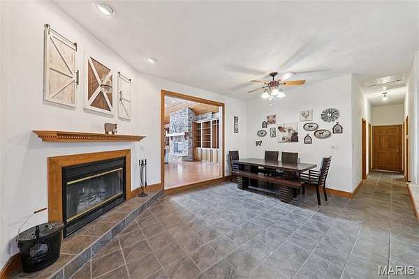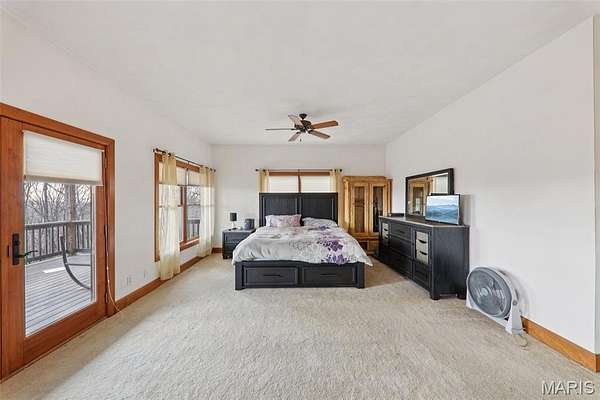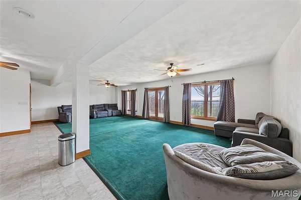 Some properties are just real estate. This one is a legacy. Set on 9.73 acres of timber, pasture, and cropland in the rolling hills of Fayette County, 102 E 725 Ave in Mulberry Grove is the kind of place people spend their whole lives looking for. About an hour from downtown St. Louis, 45 minutes from Scott Air Force Base, and less than 30 minutes from Carlyle Lake, this property puts you close enough to everything while feeling like you're a world away. Step out of the master suite and onto the deck with your morning coffee, and the entire Fayette County countryside opens up in front of you, green fields, timber edges, and a horizon that goes on forever. The suite itself is a genuine retreat: 442 sq ft with a soaking tub, double vanity, separate shower, and that walkout deck view every single morning. Inside, the main level spans approximately 3,188 sq ft built for real life. Soaring tongue-and-groove cathedral ceilings anchor the great room, where a floor-to-ceiling stone fireplace, rich hardwood floors, and a spiral staircase winding to the loft create something that feels like a high-end lodge and a forever home all at once. The kitchen carries the same craftsmanship, a center island, fireplace, and stainless steel appliances tells you exactly how this home was built. A dedicated office, breakfast nook, mudroom, laundry, and an additional bedroom and bath round out a floor plan designed for how people actually live. The loft above is the perfect reading nook or overflow sleeping space for those big weekend gatherings. Downstairs, the story gets even better. Approximately 1,110 sq ft of finished walkout basement brings total living space to roughly 4,300 sq ft, complete with a full kitchen, two bedrooms, a full bath, and a massive living area that functions as fully self-contained quarters for guests, extended family, or in-laws. A covered patio stretches nearly 57 feet across the back of the lower level, giving you another outdoor living space that looks out over the property. The infrastructure here sets this place apart from everything else on the market. An 80x140 ft pole barn, over 11,000 sq ft, part of it is insulated, features a two-post vehicle lift, and even has a batting cage built inside. Part of this building currently operates as a boat storage business generating $3,000 per year in rental income. Keep the income, expand the operation, or simply store every toy you own, this building alone changes the equation. A second 12x24 outbuilding with a dog kennel rounds out the setup for the serious outdoorsman. With grain bins on site, permanent pasture, cropland already in the ground, and plenty of room for horses, this property is ready for the homesteader who's been waiting for the right setup. The soil is here. The infrastructure is here. The land is here. You just bring the vision. And the wildlife. The trail cameras tell the story better than any listing ever could, monster velvet bucks in the summer heat, nocturnal giants slipping through the timber after dark. This land grows and holds quality whitetails season after season. Less than 30 minutes from Carlyle Lake means world-class fishing, boating, and waterfowl hunting are practically in your backyard. 4,300 sq ft of finished living space. 9.73 acres. Over 11,000 sq ft of barn. Income producing. Hunter's paradise. Homesteader's dream. Less than an hour from St. Louis. This is the kind of property you buy and never sell. The kind you pass down. Be the one who starts the story here. Lot lines are estimated in the photos.