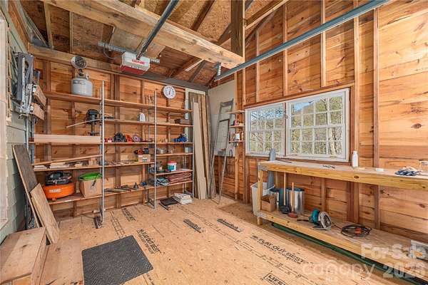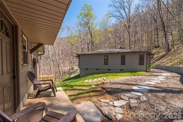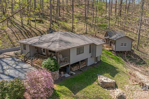 From the moment you arrive, your worries will subside in this serene, private woodland setting. Nestled on 2.4 acres, this charming cottage offers updated living spaces, an expanded covered deck, and a cozy covered porch with mountain laurel railing perfect for enjoying the solitude of the mountains and the privacy of the area. Mountain views to be enjoyed. Step inside to a welcoming living room with arched doorways, natural stone wood-burning fireplace, and hardwood floors. An adjacent bonus room provides flexible space for a reading nook or office. The kitchen features all stainless steel appliances, a new range hood, and updated tile, along with a convenient dining area. Retreat to the primary bedroom with custom built-ins for storage, and a completely remodeled bathroom that creates a fresh beautiful space to start each day. The second bedroom also includes matching wood built-ins, with a second full bath in the hall. The very attractive outbuilding has been thoughtfully updated and improved. The first space is ready and waiting for you to make it your own whether it's a studio, office or storage. This space includes new paneling and new insulation, plus a split unit HVAC system for year-round comfort. The adjoining workshop/ mini garage area is ideal for motorcycle/ATV storage. Both sides of the outbuilding are fully powered by a new 100-amp service. Driveway offers ample parking. A true mountain hideaway with comfort, flexibility, and a standout workshop/storage setup ready for you to enjoy.