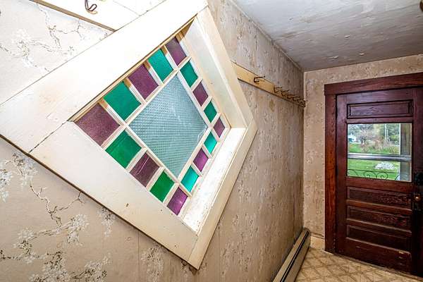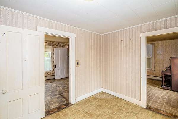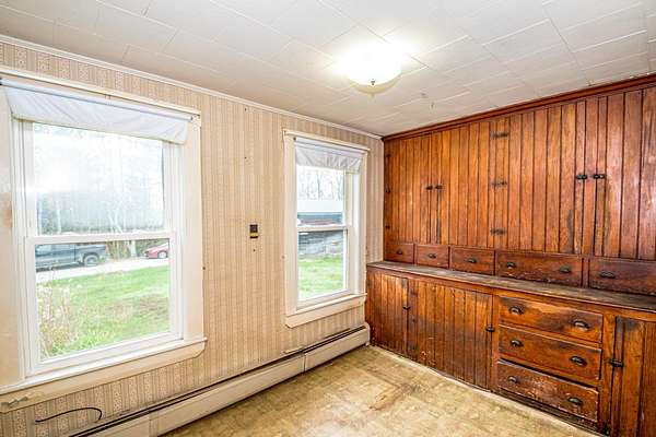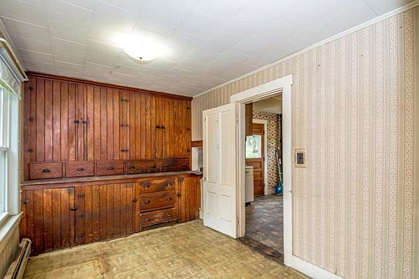 Extra large in-town +/- 1.5 acre lot, offers a cozy cape home with a front covered porch with removable sliding panels. Enter the home from the porch into a front foyer with a colored glass window and stairs to the upper level. On the main level, you will find a living room, dining room with original wooden built-in cupboards and a kitchen with access to a small back deck. Upstairs you will find 2 pass-through style bedrooms and a large full bath. You may be able to reconfigure the floor plan to give each bedroom its own entrance. Many rooms have hardwood floors that have old-style sheet linoleum over them but they may be in a condition that could be sanded and restored. The house has vinyl siding, a metal roof, replacment windows, updated electric and hot water boiler so the big items have been done. With a few cosmetic updates and some new appliances, this home will bring years of enjoyment to its new family. The basement has a poured concrete floor and offers a workbench for the handyman in the family and room for storage. The large back yards has several apple trees and a large garden area for those who are interested in homesteading. There is a shed for storage of the outdoor equipment and gardening tools. Located near the end of a dead-end street and the ATV trail can be accessed nearby. Come take a look and just imagine what you could do to add your own touch.
