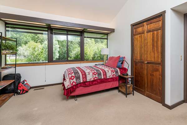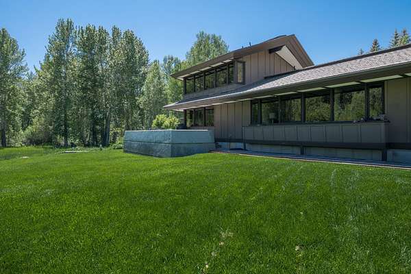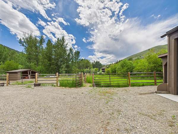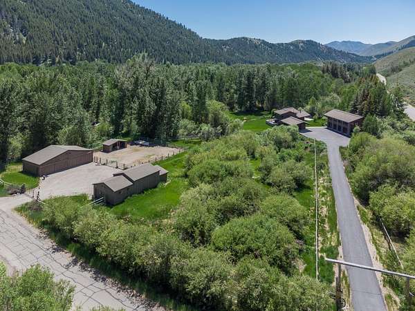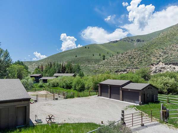 This architecturally significant home, inspired by Frank Lloyd Wright and designed by Taliesin West apprentice Lois Gottlieb, is located on 5.2 acres with a 1/4 mile of the East Fork of the Big Wood River frontage. Set in a pristine, natural environment with breathtaking views of the Pioneer Mountains, this property offers unmatched privacy and serenity- punctuated only by the soothing sound of the river without the white noise of Highway 75. The 2-bedroom, 2-bathroom main residence features an organic flow between indoor and outdoor living. Walls of glass in the kitchen and open-concept living area frame the river and landscape beyond. A spacious deck off the dining area and a shaded patio off the living room enhance the seamless indoor-outdoor connection. The cantilevered roof provides shade and also covers the carport off the mudroom. In addition to the main home, the property includes a 2-bedroom, 1.5-bath guest apartment above a 4-car heated garage. The apartment boasts its own private deck and panoramic mountain views, making it perfect for visitors or additional living space. The garage offers extensive storage and dedicated rooms for a workshop, bikes, skis, and more. Equestrian enthusiasts will appreciate the 48' x 48' architecturally complementary barn with two horse stalls, insulated tack room, and room for tractors or vehicles. A separate 20' x 35' heated workshop and additional 3-car storage area complete the barn setup. The fully fenced pasture and large corral with moveable shelters round out the barnyard. This rare and special property offers endless possibilities. Enjoy all-day sun, dark night skies, year-round wildlife viewing, and total seclusionall just minutes from town. There truly is nothing else like it in the Wood River Valley. This property comes with water rights. See under documents.