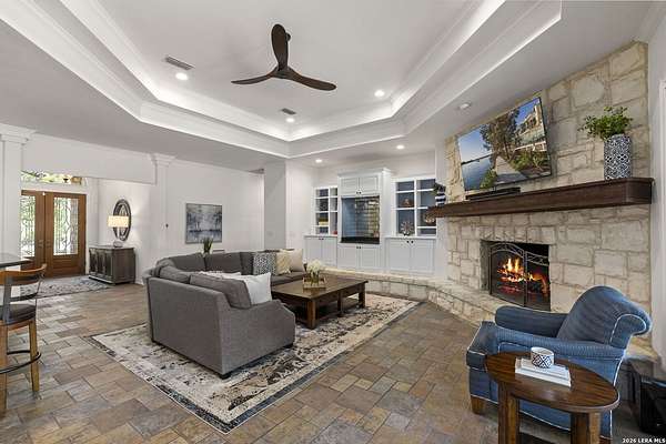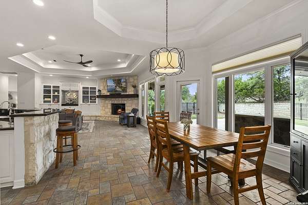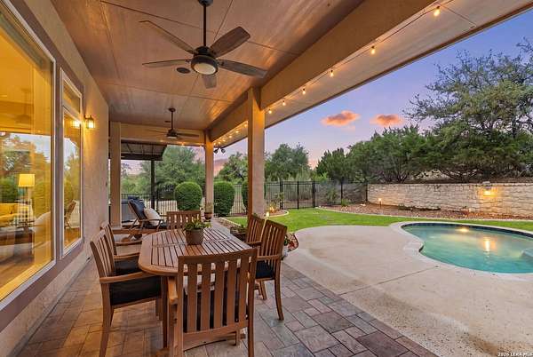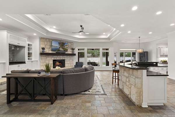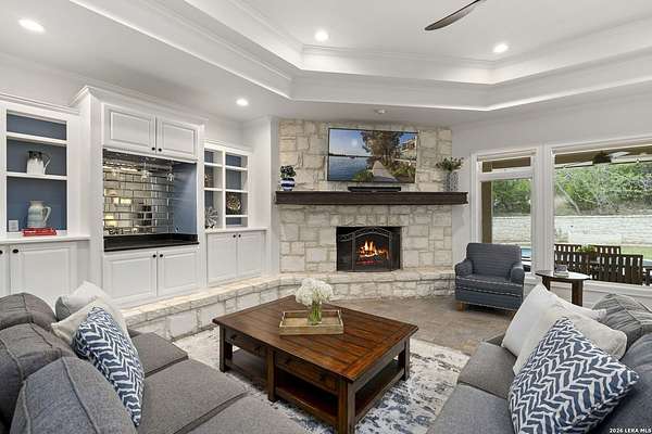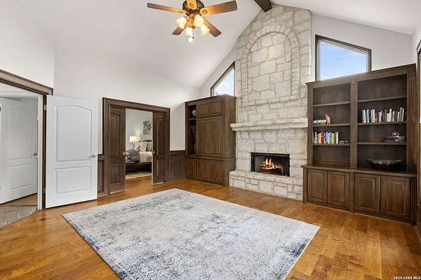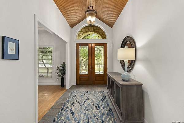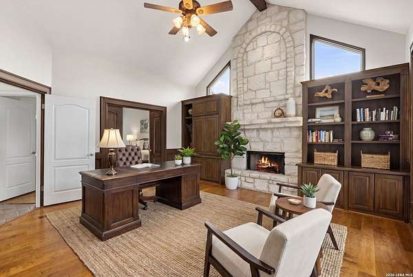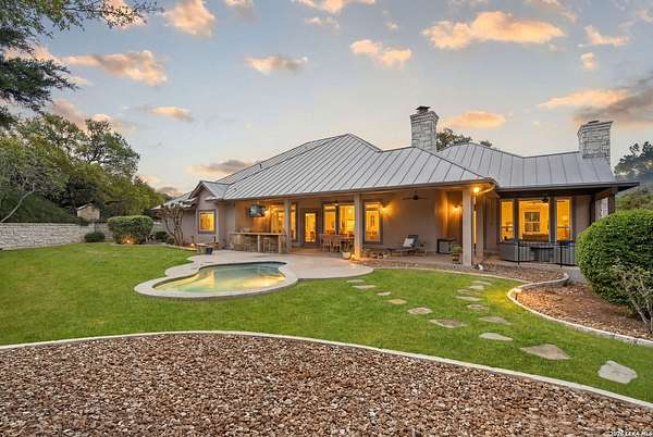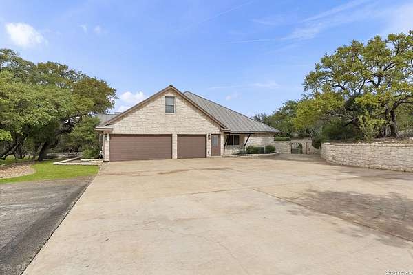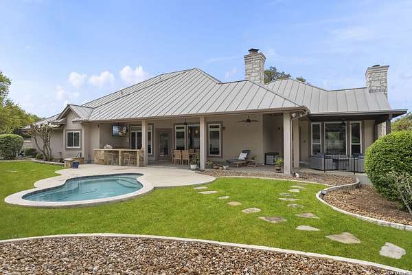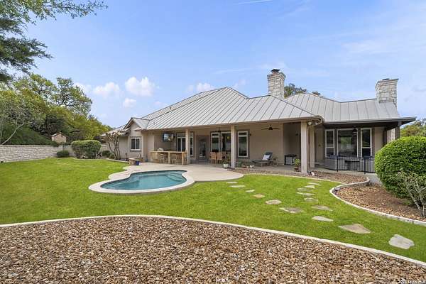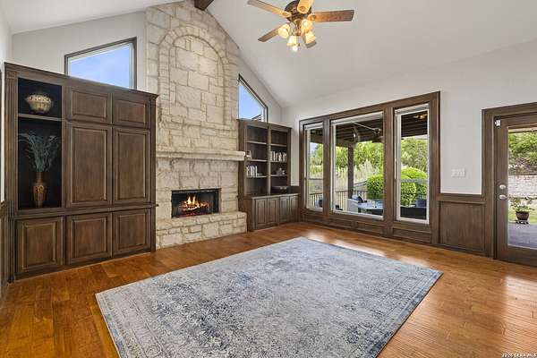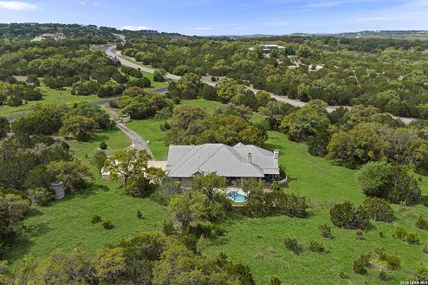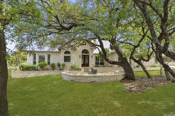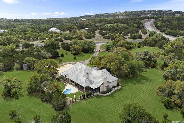 This beautiful, single-story home is nestled on 4.42 sprawling acres with mature trees behind a private gated entrance! The open floor plan is highlighted by detailed tile and hardwood flooring, ceiling treatments, crown mouldings and an abundance of natural light streaming through Pella windows and plantation shutters. At the heart of the home, the warm and inviting great room features a stunning wood-burning stone fireplace, custom built-in shelving and picturesque views of the private backyard. This space flows effortlessly into the gourmet kitchen and breakfast nook-perfect for both everyday living and effortless entertaining. The island kitchen offers a wraparound seating bar, generous workspace, custom cabinetry, stainless steel appliances and a convenient adjacent home management center. The separate dining room provides an ideal setting for Sunday brunches and holiday gatherings, complete with tranquil property views and a buffet area accented by glass-front cabinetry. Working from home becomes a true privilege in the private study, showcasing a soaring vaulted ceiling, a striking wood-burning stone fireplace, dual built-in bookshelves and cabinetry, exterior access and serene views of the surrounding landscape. Depending on your lifestyle necessities the study can also serve as a secondary living space or flex room. The owner's suite is a relaxing escape featuring separate vanities, a jetted Royal soaking tub and a seamless glass walk-in shower. Three spacious secondary bedrooms and a laundry room complete the interior. Designed for exceptional outdoor living, the backyard is an entertainer's dream. Multiple covered patios with an outdoor speaker system by Sonos offer inviting spaces for lounging and dining, all overlooking a sparkling heated pool for year-round enjoyment. The expansive lawn provides ample space for recreation and relaxation. The oversized three car garage is complete with epoxy flooring and provides access to the spacious upstairs storage room that is perfect for all your overflow and holiday items. Ideally located with easy access to the main guarded entrance and The Clubs, this remarkable property offers the perfect blend of privacy, luxury, and convenience capturing Hill Country living at its finest.