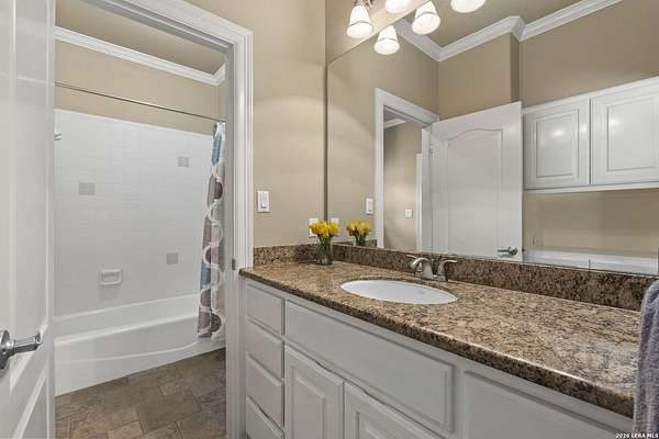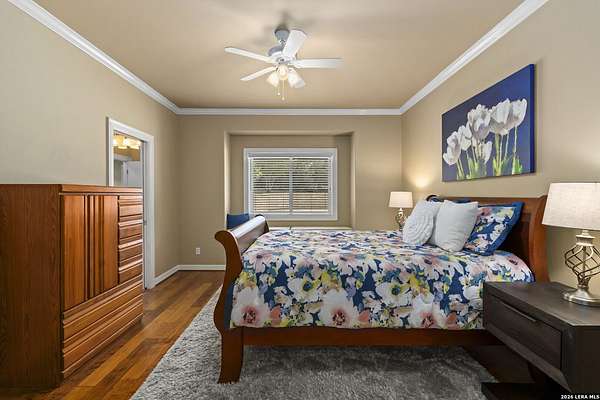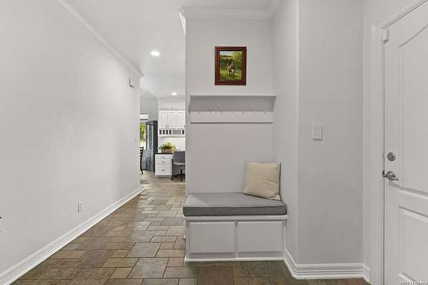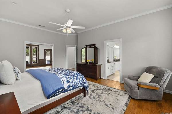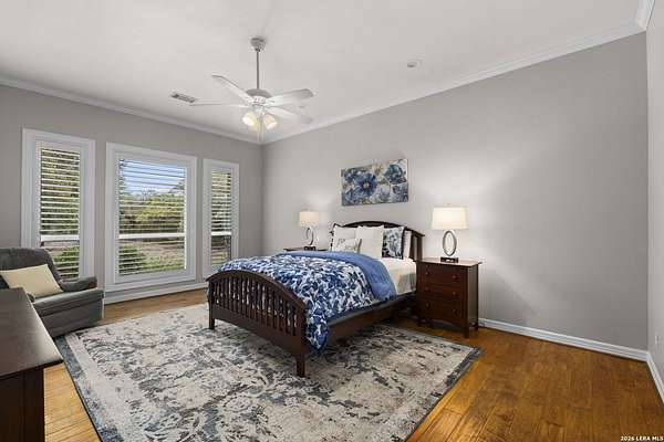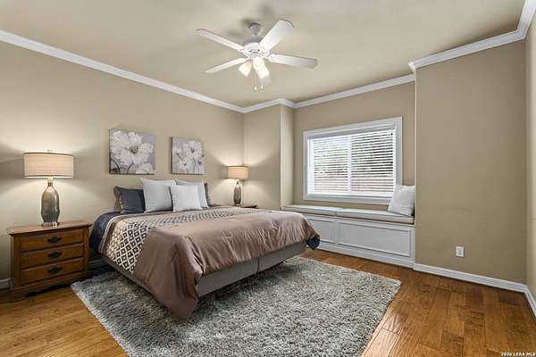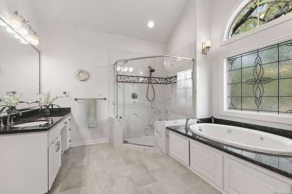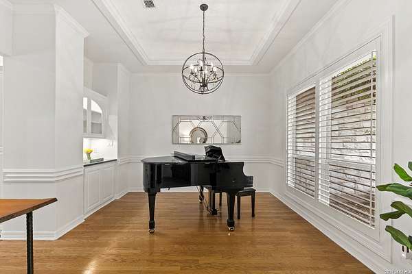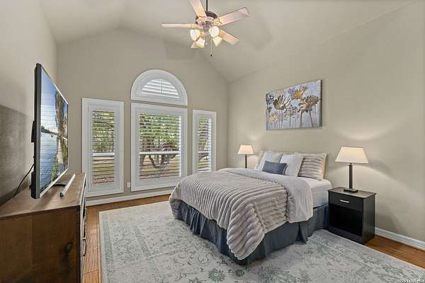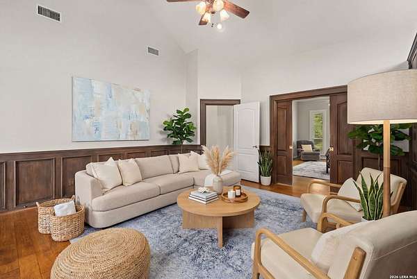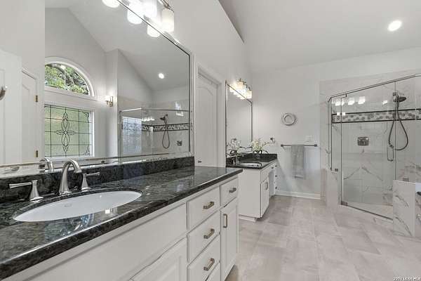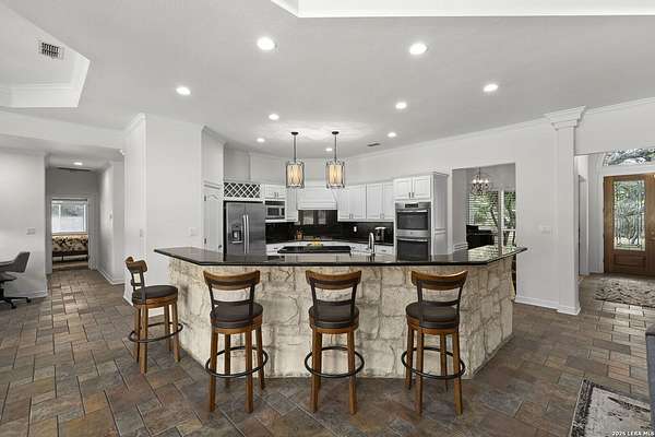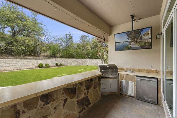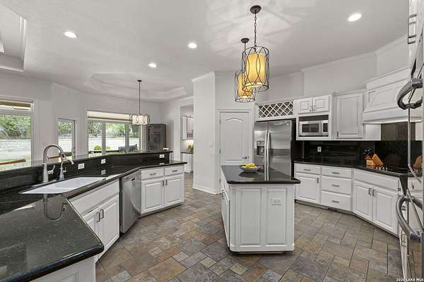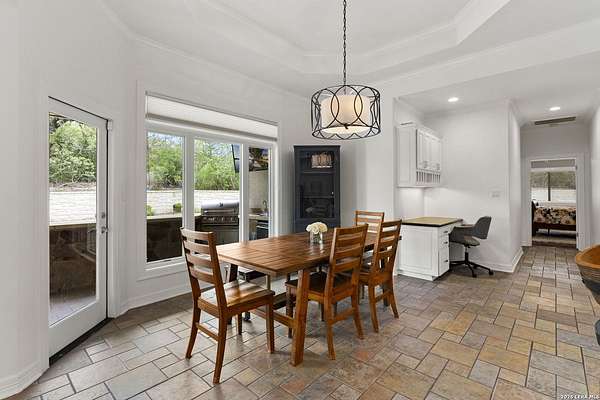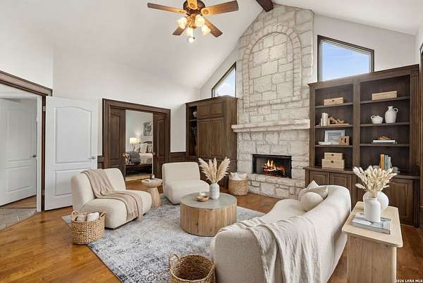 This beautiful, single-story home is nestled on 4.42 sprawling acres with mature trees behind a private gated entrance! The open floor plan is highlighted by detailed tile and hardwood flooring, ceiling treatments, crown mouldings and an abundance of natural light streaming through Pella windows and plantation shutters. At the heart of the home, the warm and inviting great room features a stunning wood-burning stone fireplace, custom built-in shelving and picturesque views of the private backyard. This space flows effortlessly into the gourmet kitchen and breakfast nook-perfect for both everyday living and effortless entertaining. The island kitchen offers a wraparound seating bar, generous workspace, custom cabinetry, stainless steel appliances and a convenient adjacent home management center. The separate dining room provides an ideal setting for Sunday brunches and holiday gatherings, complete with tranquil property views and a buffet area accented by glass-front cabinetry. Working from home becomes a true privilege in the private study, showcasing a soaring vaulted ceiling, a striking wood-burning stone fireplace, dual built-in bookshelves and cabinetry, exterior access and serene views of the surrounding landscape. Depending on your lifestyle necessities the study can also serve as a secondary living space or flex room. The owner's suite is a relaxing escape featuring separate vanities, a jetted Royal soaking tub and a seamless glass walk-in shower. Three spacious secondary bedrooms and a laundry room complete the interior. Designed for exceptional outdoor living, the backyard is an entertainer's dream. Multiple covered patios with an outdoor speaker system by Sonos offer inviting spaces for lounging and dining, all overlooking a sparkling heated pool for year-round enjoyment. The expansive lawn provides ample space for recreation and relaxation. The oversized three car garage is complete with epoxy flooring and provides access to the spacious upstairs storage room that is perfect for all your overflow and holiday items. Ideally located with easy access to the main guarded entrance and The Clubs, this remarkable property offers the perfect blend of privacy, luxury, and convenience capturing Hill Country living at its finest.